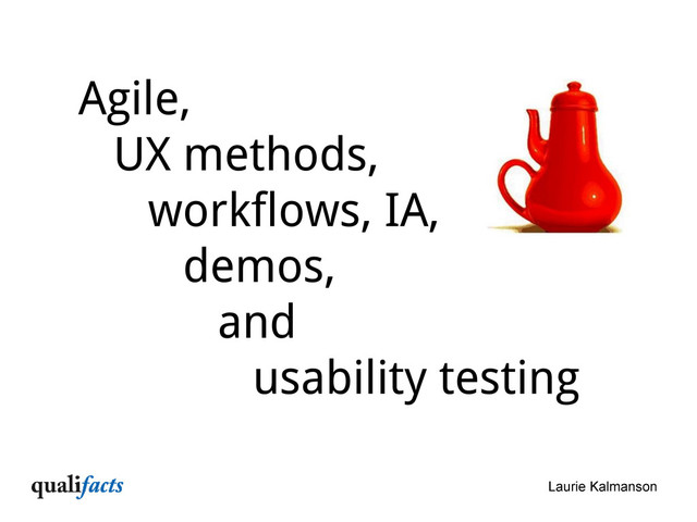 the goal -- and success -- of the test is to discover and share what makes sense, and what doesn’t. “The more you can tell me about what makes sense and what doesn’t, the more you will be helping me, and the team, make it easier for people to do their work.” “I’m not the one who built these screens, so my feelings won’t be hurt when you tell me about the things that don’ t make sense to you.” Agile, UX methods, workflows and IA, demos, and usability testing