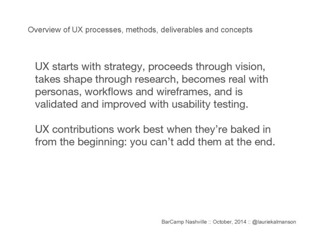with strategy, proceeds through vision, takes shape through research, becomes real with personas, workflows and wireframes, and is validated and improved with usability testing. UX contributions work best when they’re baked in from the beginning: you can’t add them at the end. BarCamp Nashville :: October, 2014 :: @lauriekalmanson