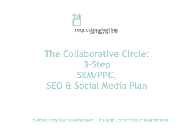 twitter.com/lauriekalmanson | linkedin.com/in/lauriekalmanson Step 1: Search engine marketing, pay per click (SEM/PPC) and Google AdWords Think of 100 keywords, run through the tool, get an estimate, evaluate and make a go/no go decision. If you can write a haiku, you can write Google AdWords campaigns. Learn, adjust. Repeat.