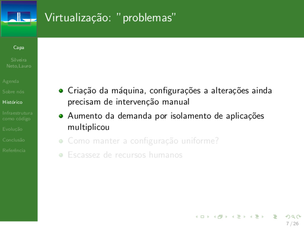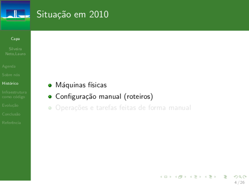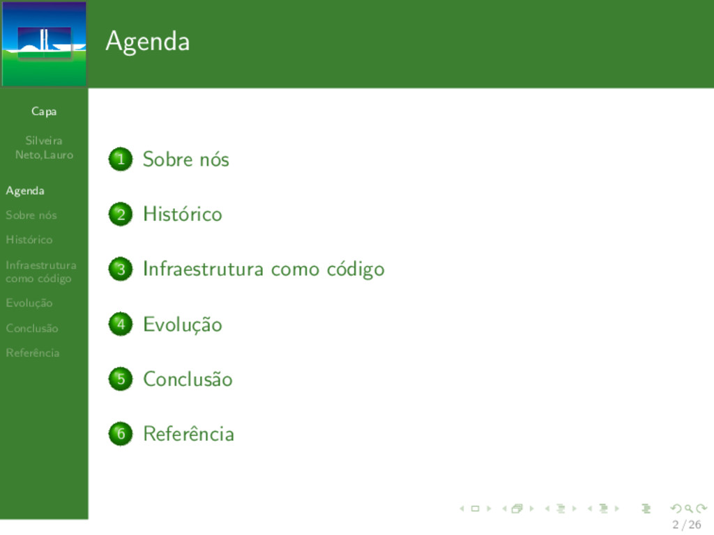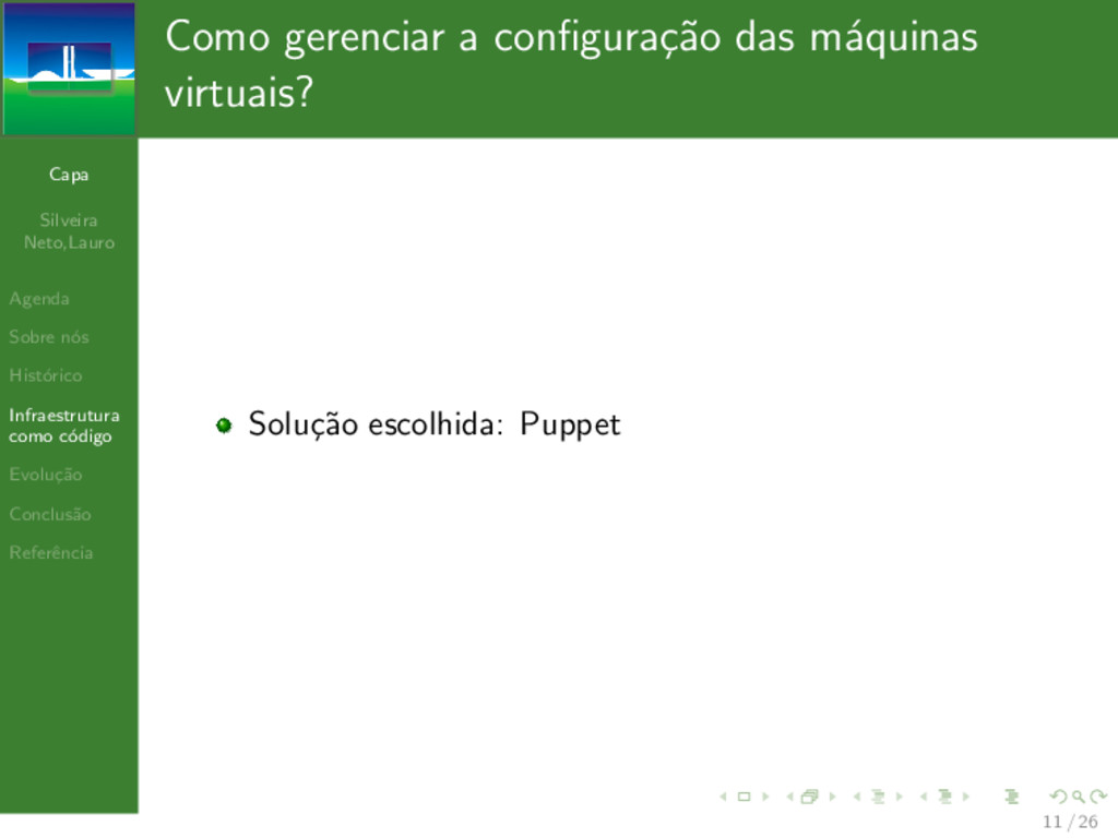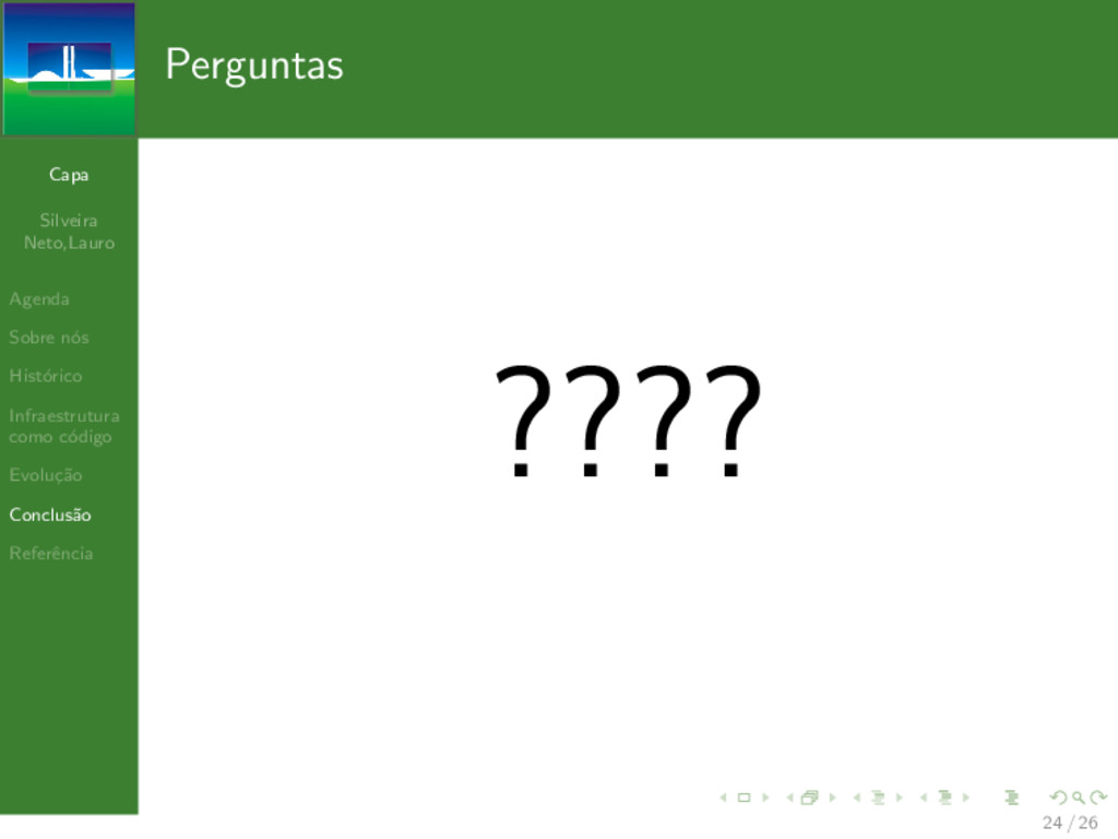 como c´ odigo Evolu¸ c˜ ao Conclus˜ ao Referˆ encia Agenda 1 Sobre n´ os 2 Hist´ orico 3 Infraestrutura como c´ odigo 4 Evolu¸ c˜ ao 5 Conclus˜ ao 6 Referˆ encia 2 / 26
