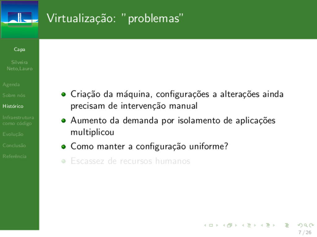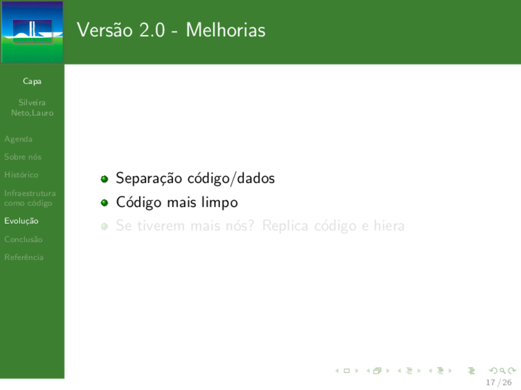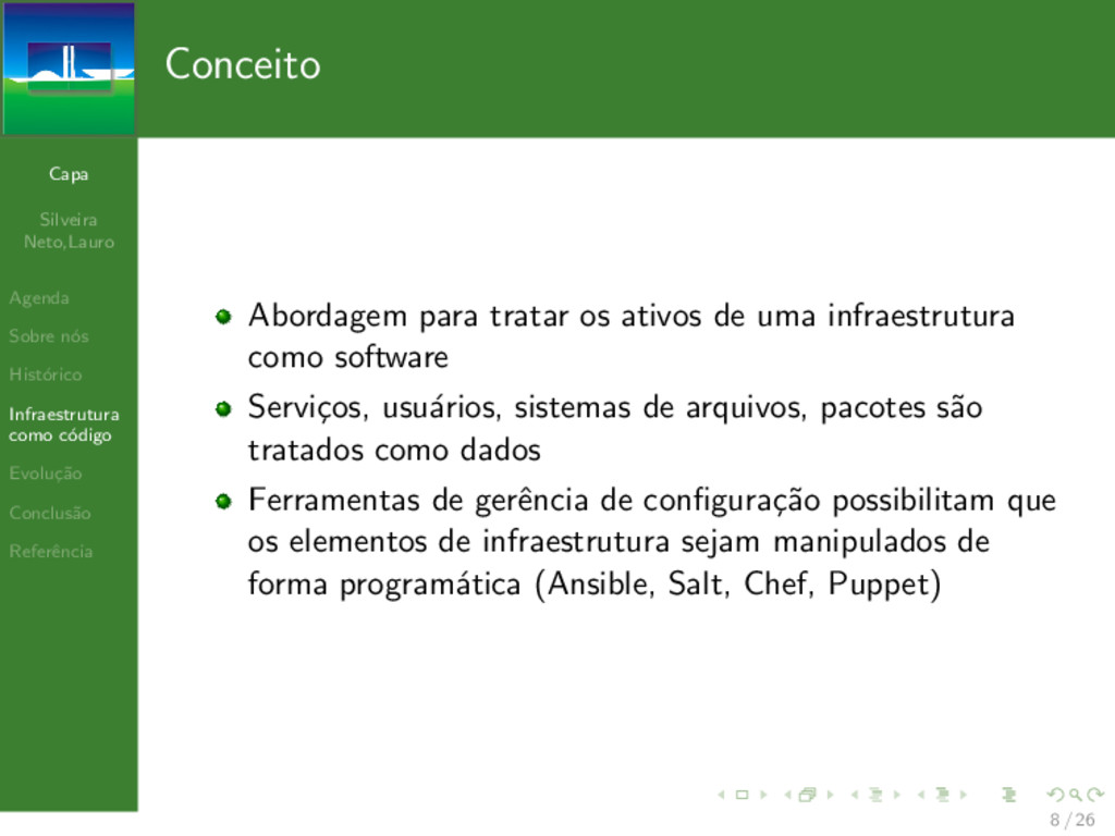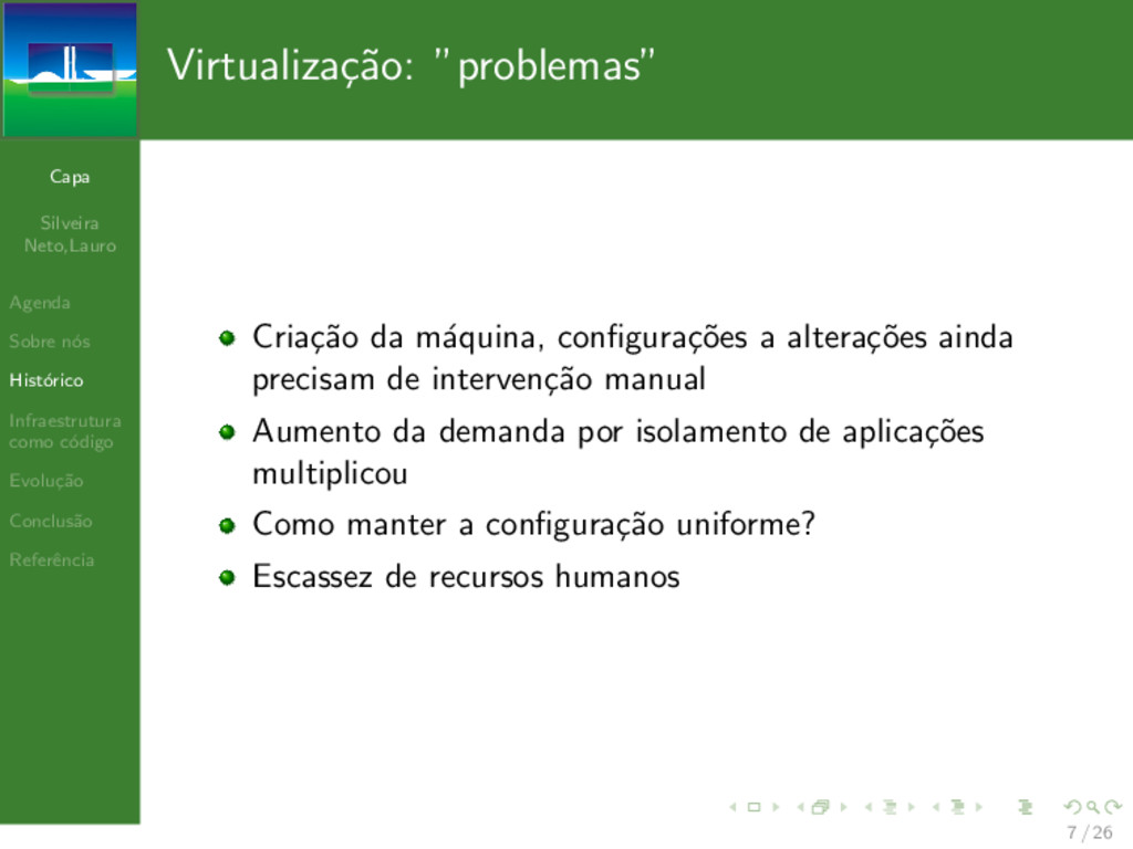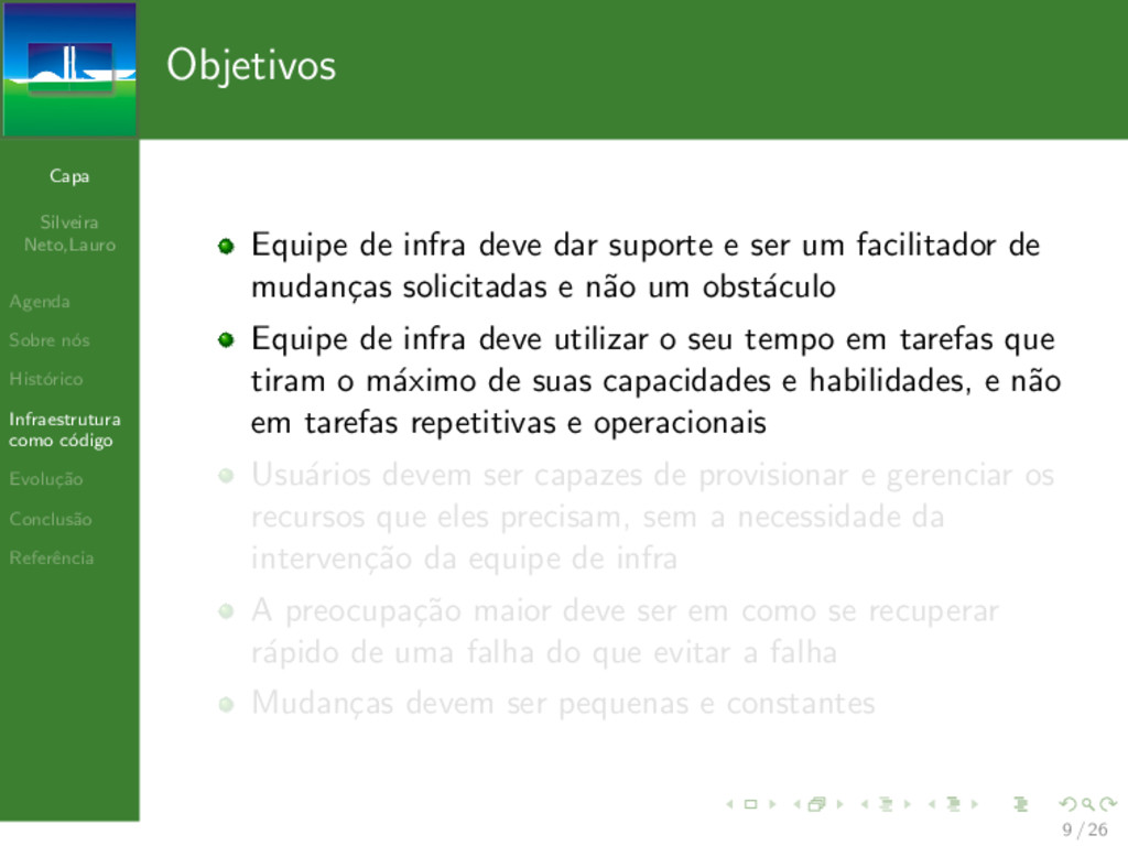 como c´ odigo Evolu¸ c˜ ao Conclus˜ ao Referˆ encia Agenda 1 Sobre n´ os 2 Hist´ orico 3 Infraestrutura como c´ odigo 4 Evolu¸ c˜ ao 5 Conclus˜ ao 6 Referˆ encia 2 / 26