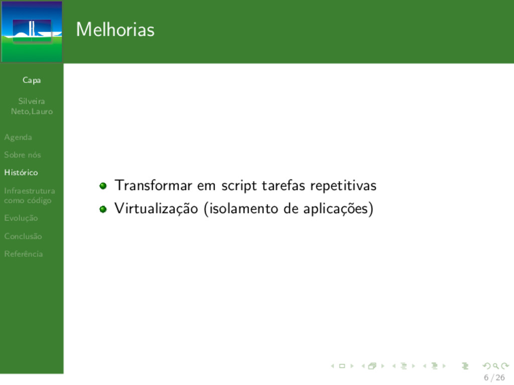 como c´ odigo Evolu¸ c˜ ao Conclus˜ ao Referˆ encia Melhorias Transformar em script tarefas repetitivas Virtualiza¸ c˜ ao (isolamento de aplica¸ c˜ oes) 6 / 26