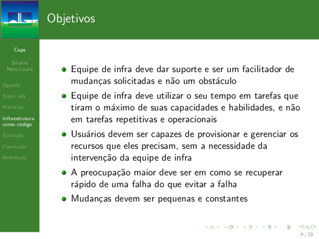como c´ odigo Evolu¸ c˜ ao Conclus˜ ao Referˆ encia Objetivos Equipe de infra deve dar suporte e ser um facilitador de mudan¸ cas solicitadas e n˜ ao um obst´ aculo Equipe de infra deve utilizar o seu tempo em tarefas que tiram o m´ aximo de suas capacidades e habilidades, e n˜ ao em tarefas repetitivas e operacionais Usu´ arios devem ser capazes de provisionar e gerenciar os recursos que eles precisam, sem a necessidade da interven¸ c˜ ao da equipe de infra A preocupa¸ c˜ ao maior deve ser em como se recuperar r´ apido de uma falha do que evitar a falha Mudan¸ cas devem ser pequenas e constantes 9 / 26