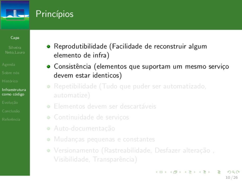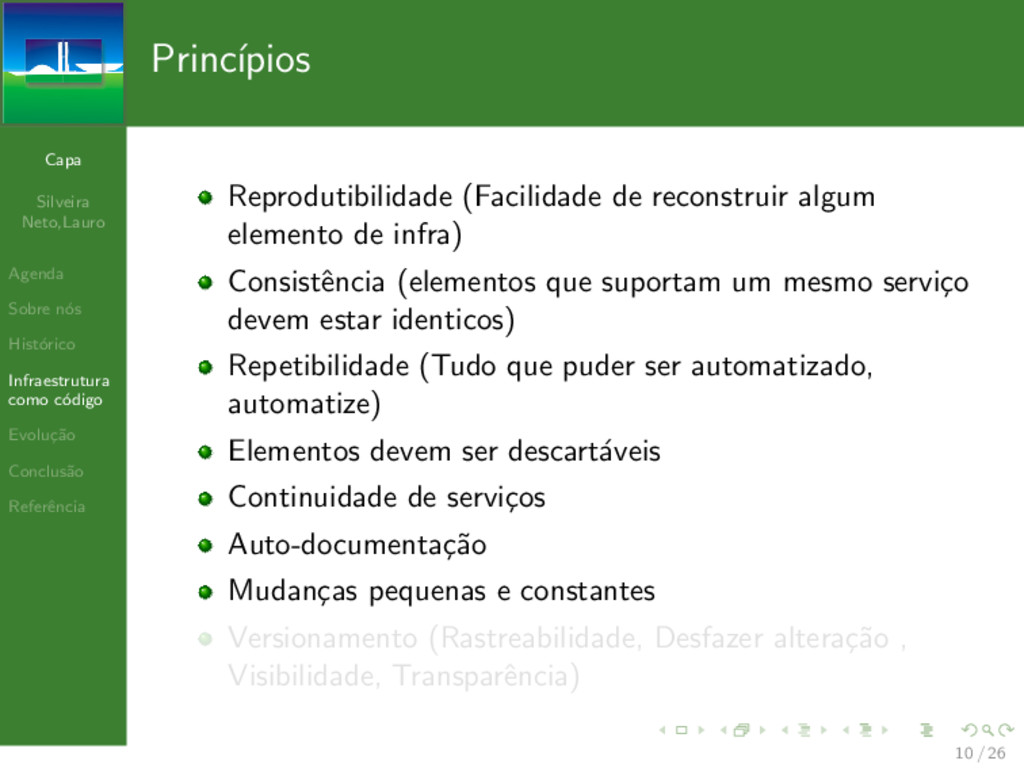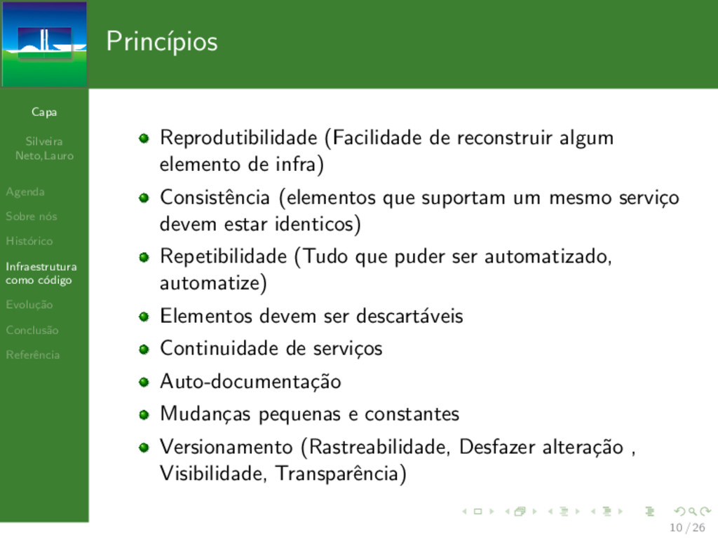como c´ odigo Evolu¸ c˜ ao Conclus˜ ao Referˆ encia Princ´ ıpios Reprodutibilidade (Facilidade de reconstruir algum elemento de infra) Consistˆ encia (elementos que suportam um mesmo servi¸ co devem estar identicos) Repetibilidade (Tudo que puder ser automatizado, automatize) Elementos devem ser descart´ aveis Continuidade de servi¸ cos Auto-documenta¸ c˜ ao Mudan¸ cas pequenas e constantes Versionamento (Rastreabilidade, Desfazer altera¸ c˜ ao , Visibilidade, Transparˆ encia) 10 / 26