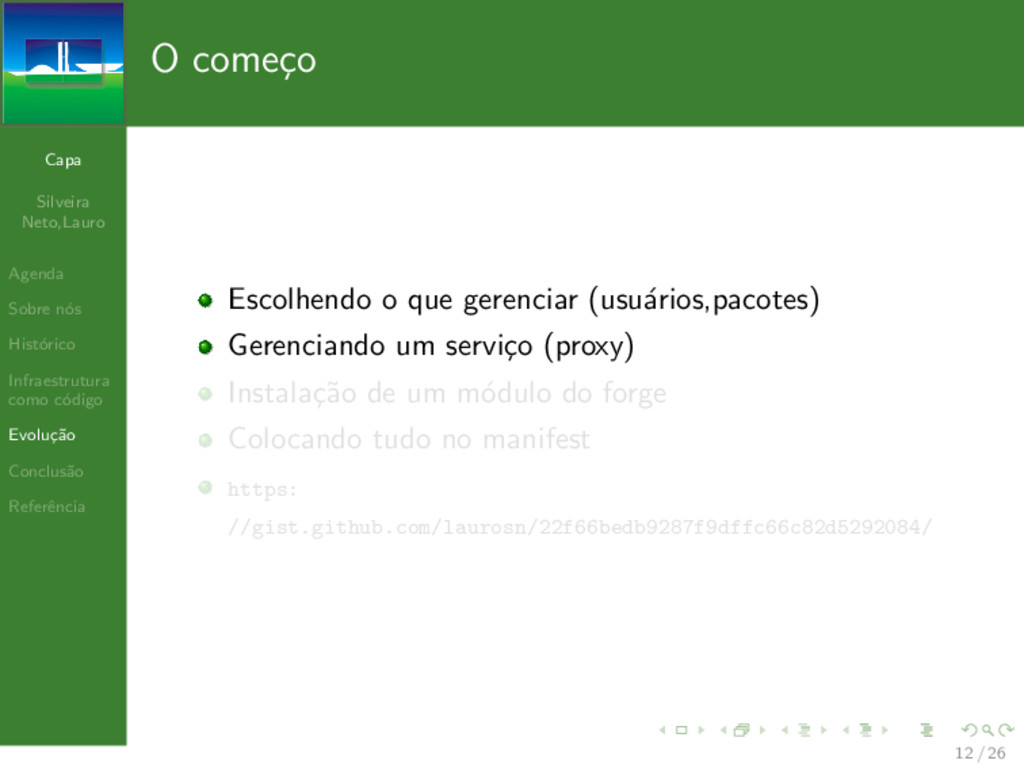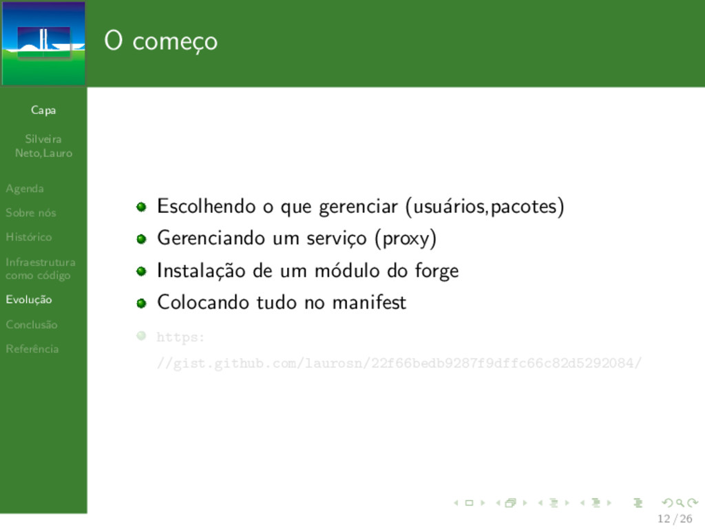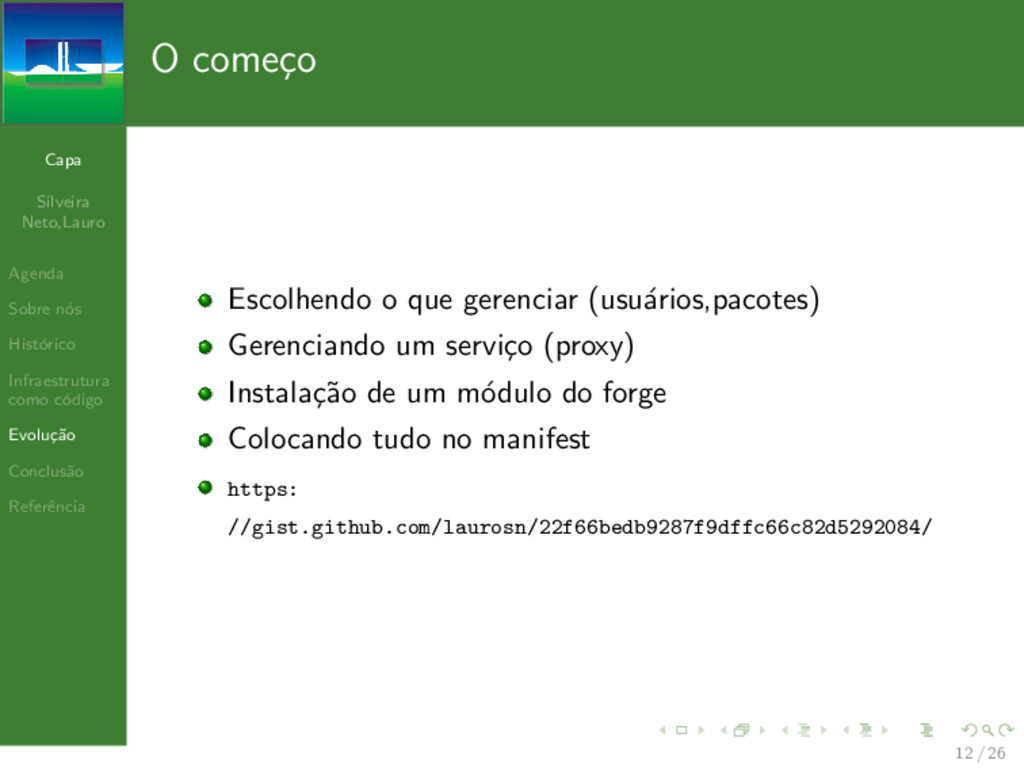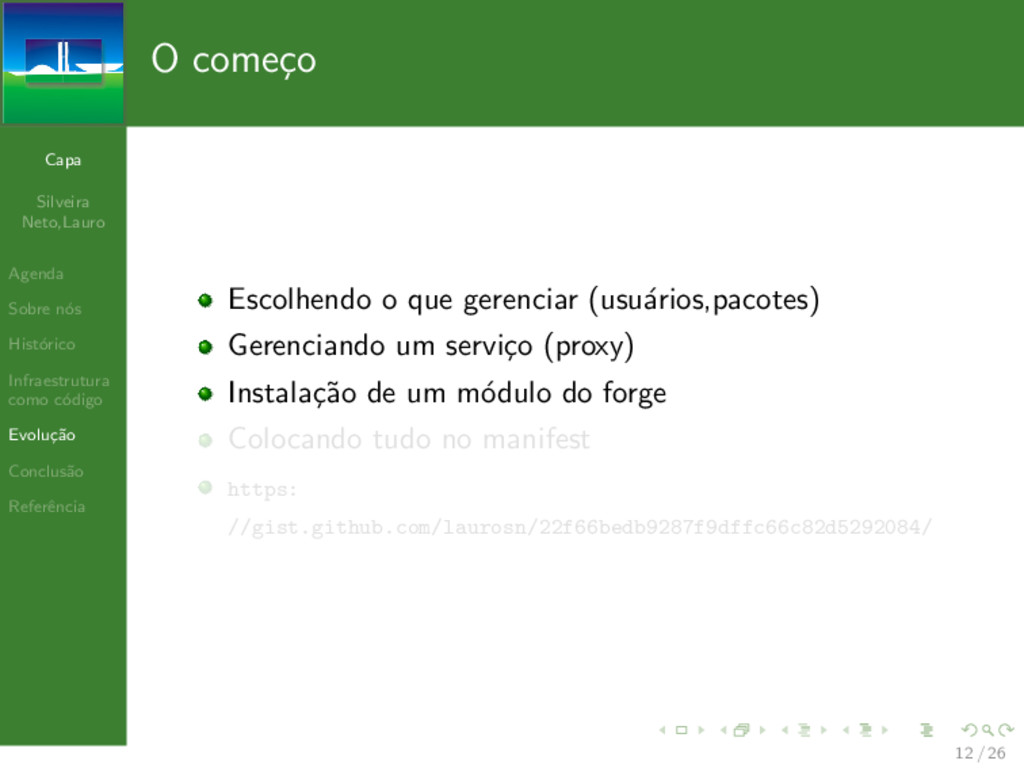 como c´ odigo Evolu¸ c˜ ao Conclus˜ ao Referˆ encia O come¸ co Escolhendo o que gerenciar (usu´ arios,pacotes) Gerenciando um servi¸ co (proxy) Instala¸ c˜ ao de um m´ odulo do forge Colocando tudo no manifest https: //gist.github.com/laurosn/22f66bedb9287f9dffc66c82d5292084/ 12 / 26