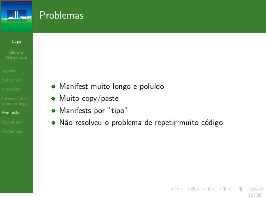 como c´ odigo Evolu¸ c˜ ao Conclus˜ ao Referˆ encia Problemas Manifest muito longo e polu´ ıdo Muito copy/paste Manifests por ”tipo” N˜ ao resolveu o problema de repetir muito c´ odigo 13 / 26