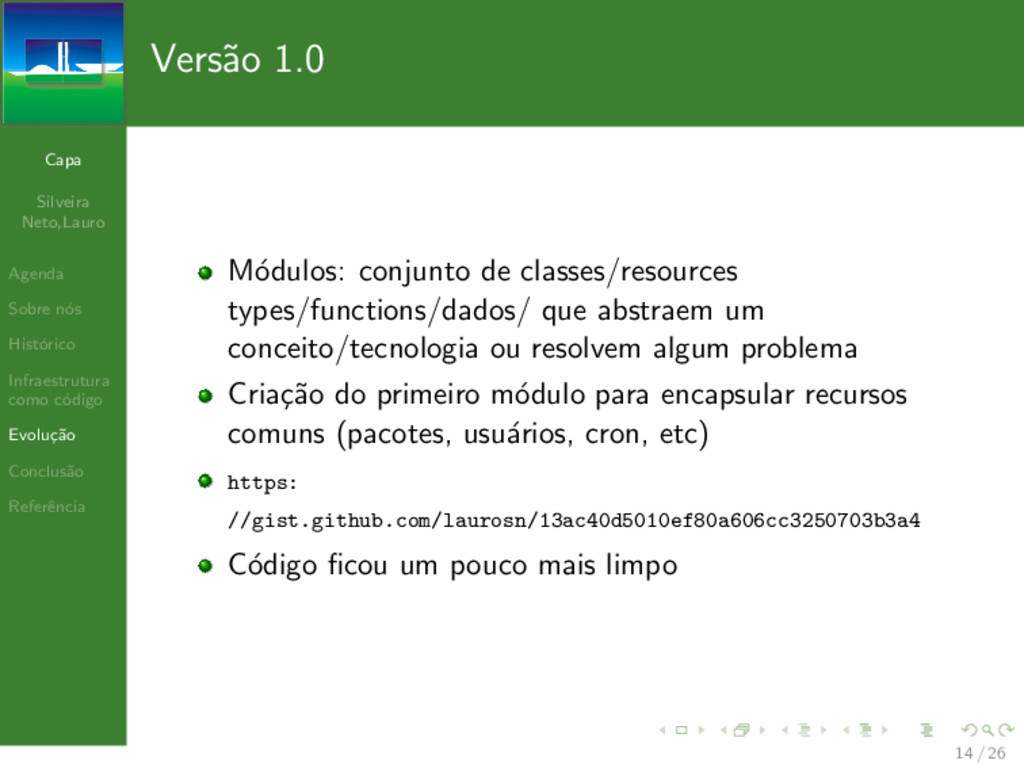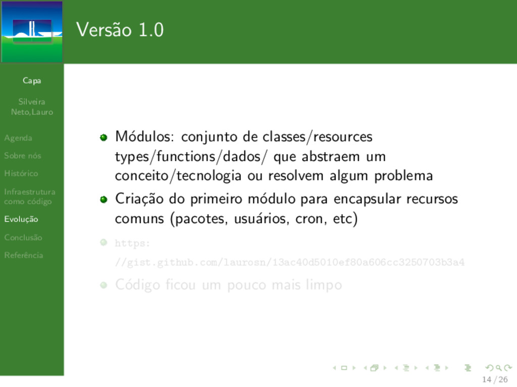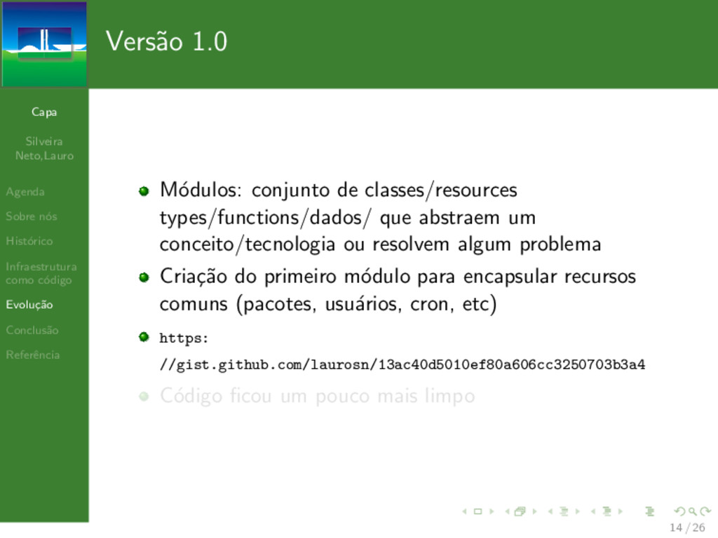 como c´ odigo Evolu¸ c˜ ao Conclus˜ ao Referˆ encia Vers˜ ao 1.0 M´ odulos: conjunto de classes/resources types/functions/dados/ que abstraem um conceito/tecnologia ou resolvem algum problema Cria¸ c˜ ao do primeiro m´ odulo para encapsular recursos comuns (pacotes, usu´ arios, cron, etc) https: //gist.github.com/laurosn/13ac40d5010ef80a606cc3250703b3a4 C´ odigo ficou um pouco mais limpo 14 / 26