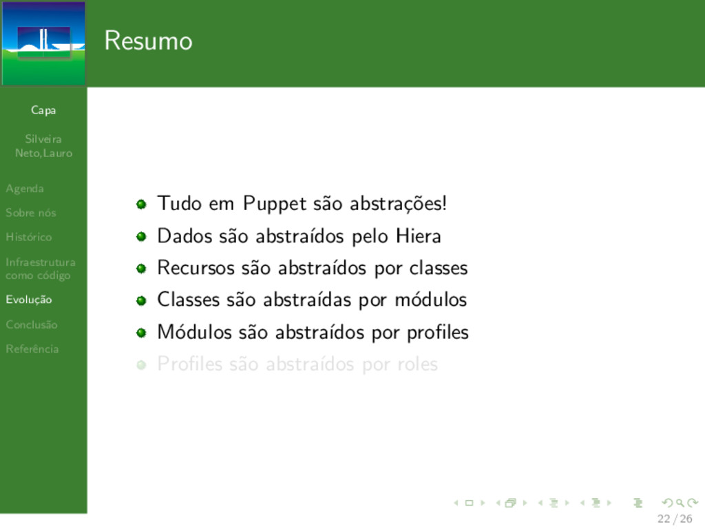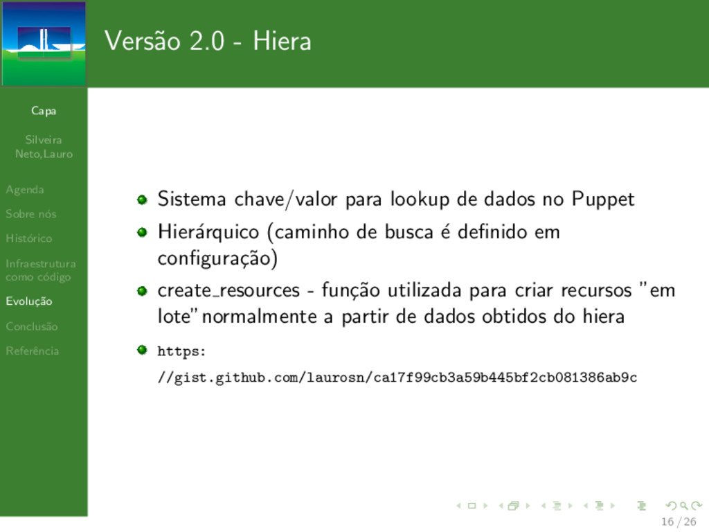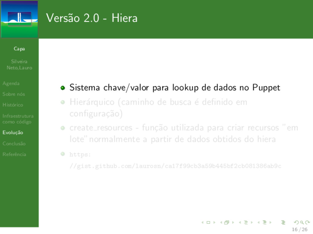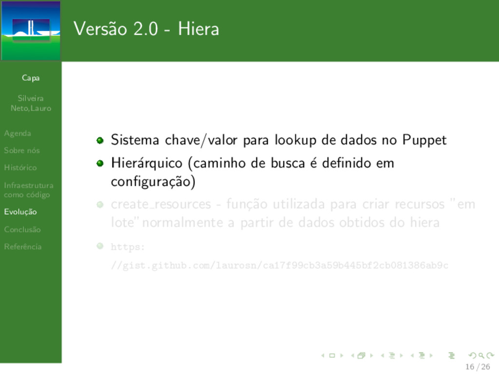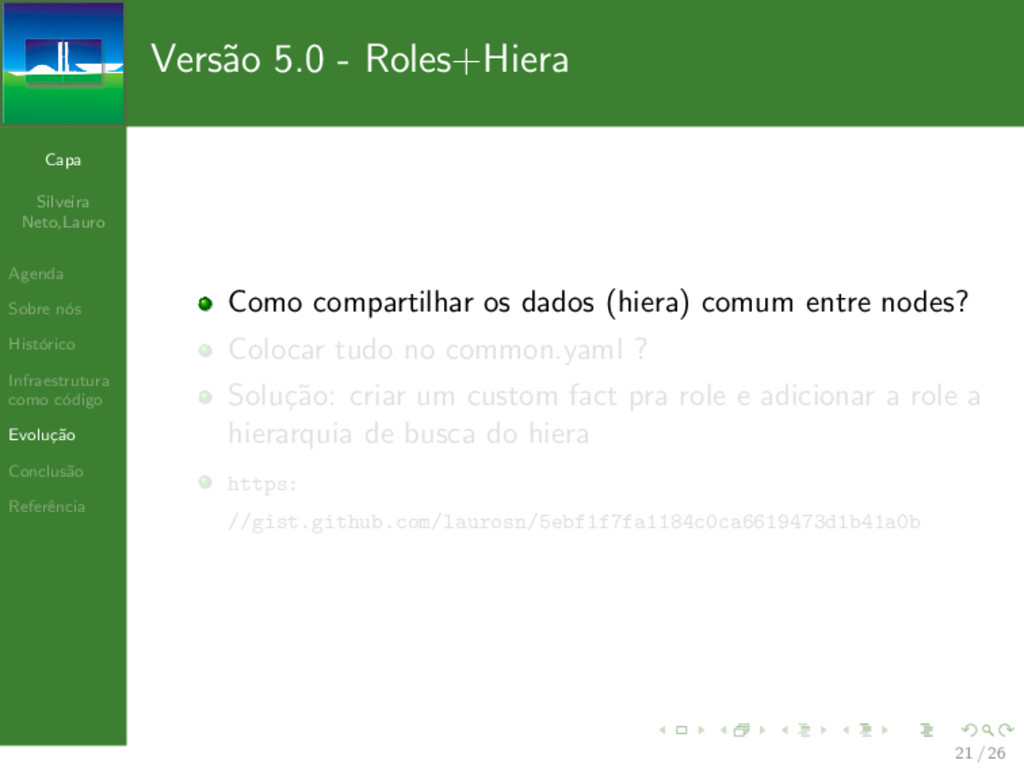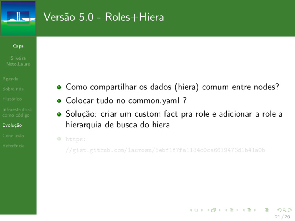 como c´ odigo Evolu¸ c˜ ao Conclus˜ ao Referˆ encia Vers˜ ao 5.0 - Roles+Hiera Como compartilhar os dados (hiera) comum entre nodes? Colocar tudo no common.yaml ? Solu¸ c˜ ao: criar um custom fact pra role e adicionar a role a hierarquia de busca do hiera https: //gist.github.com/laurosn/5ebf1f7fa1184c0ca6619473d1b41a0b 21 / 26