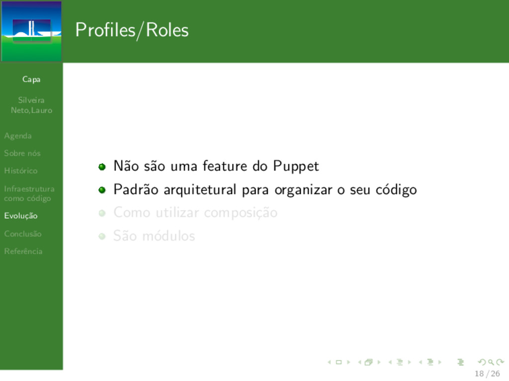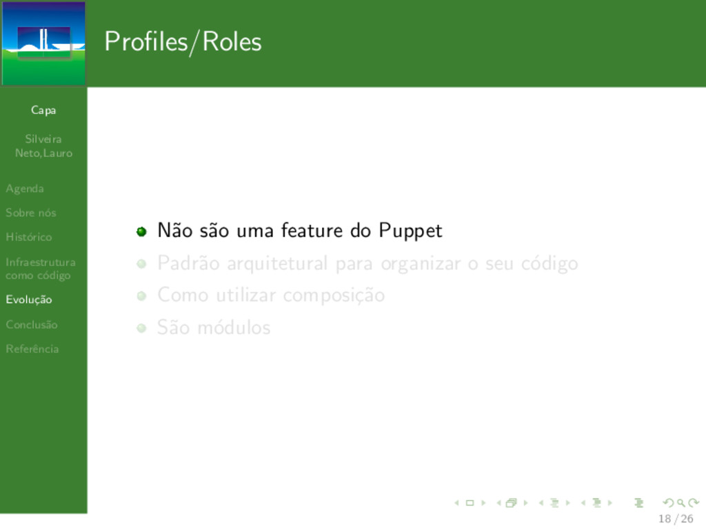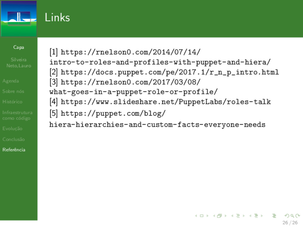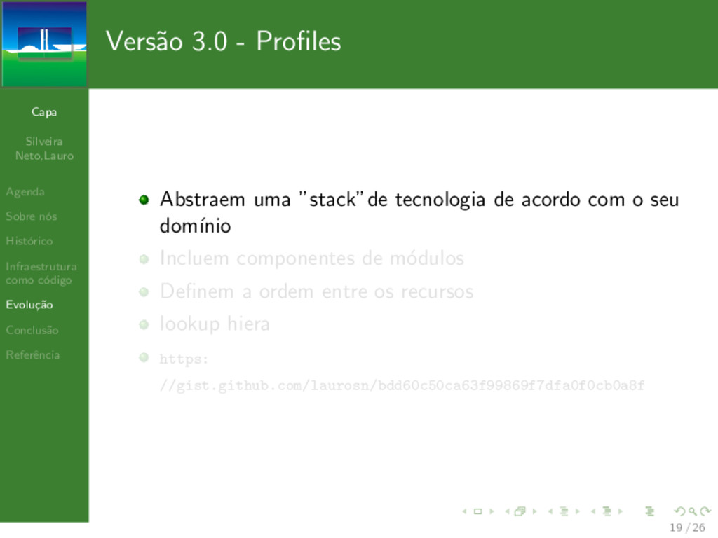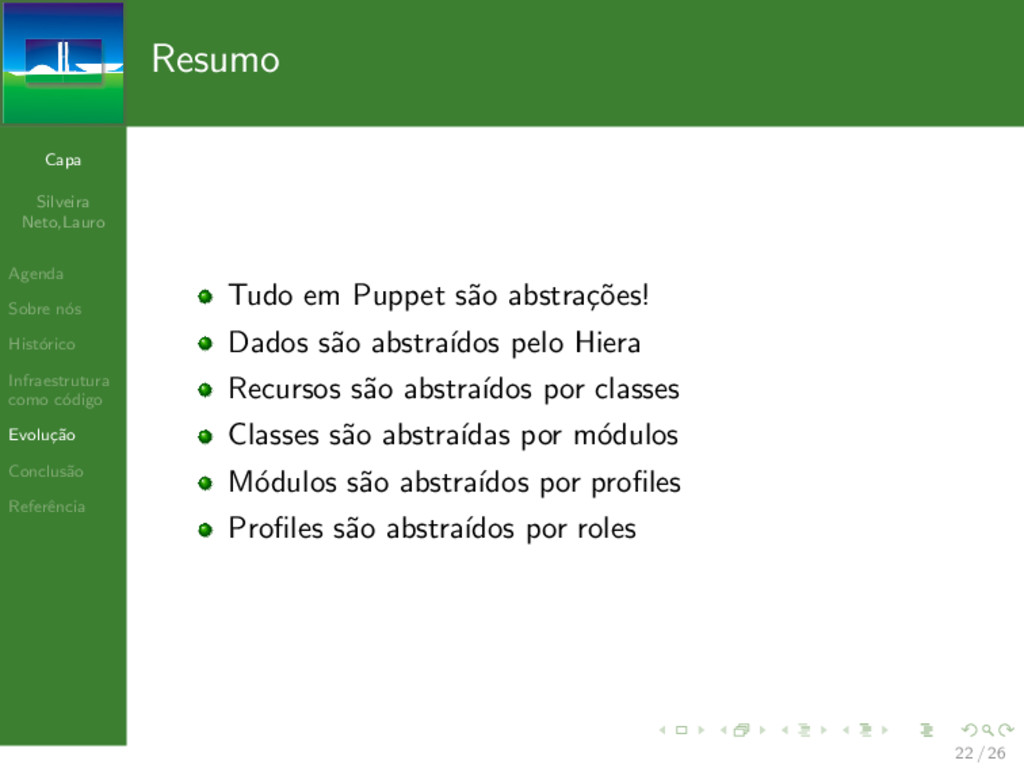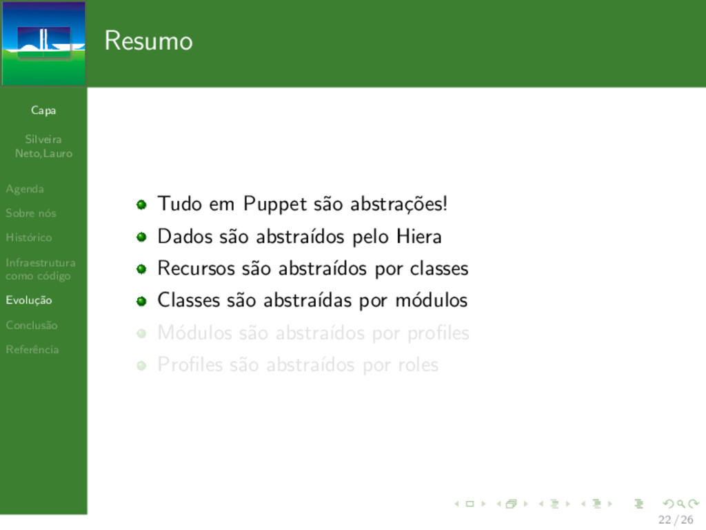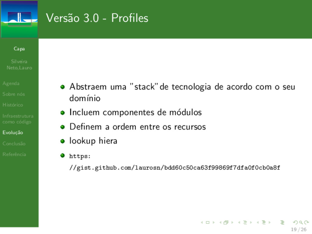 como c´ odigo Evolu¸ c˜ ao Conclus˜ ao Referˆ encia Vers˜ ao 5.0 - Roles+Hiera Como compartilhar os dados (hiera) comum entre nodes? Colocar tudo no common.yaml ? Solu¸ c˜ ao: criar um custom fact pra role e adicionar a role a hierarquia de busca do hiera https: //gist.github.com/laurosn/5ebf1f7fa1184c0ca6619473d1b41a0b 21 / 26