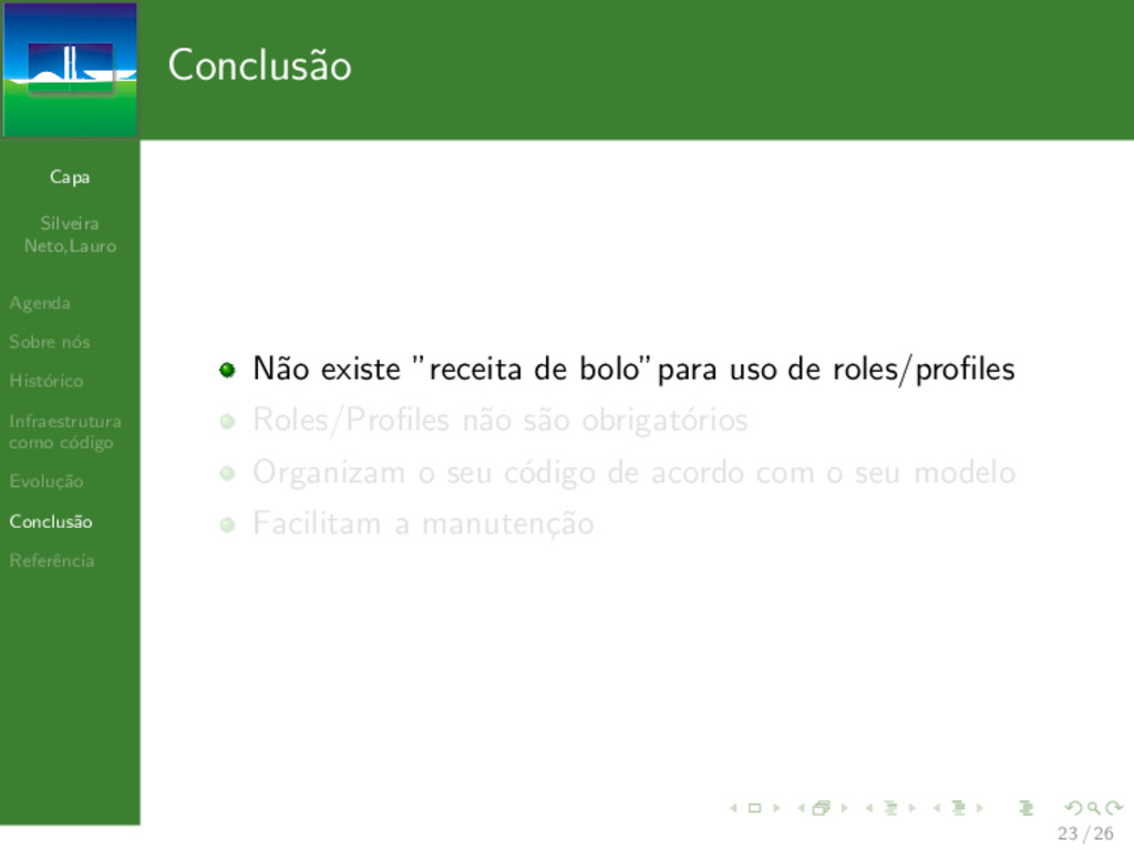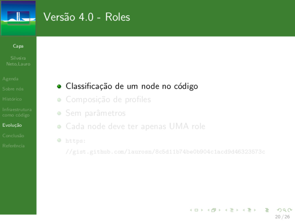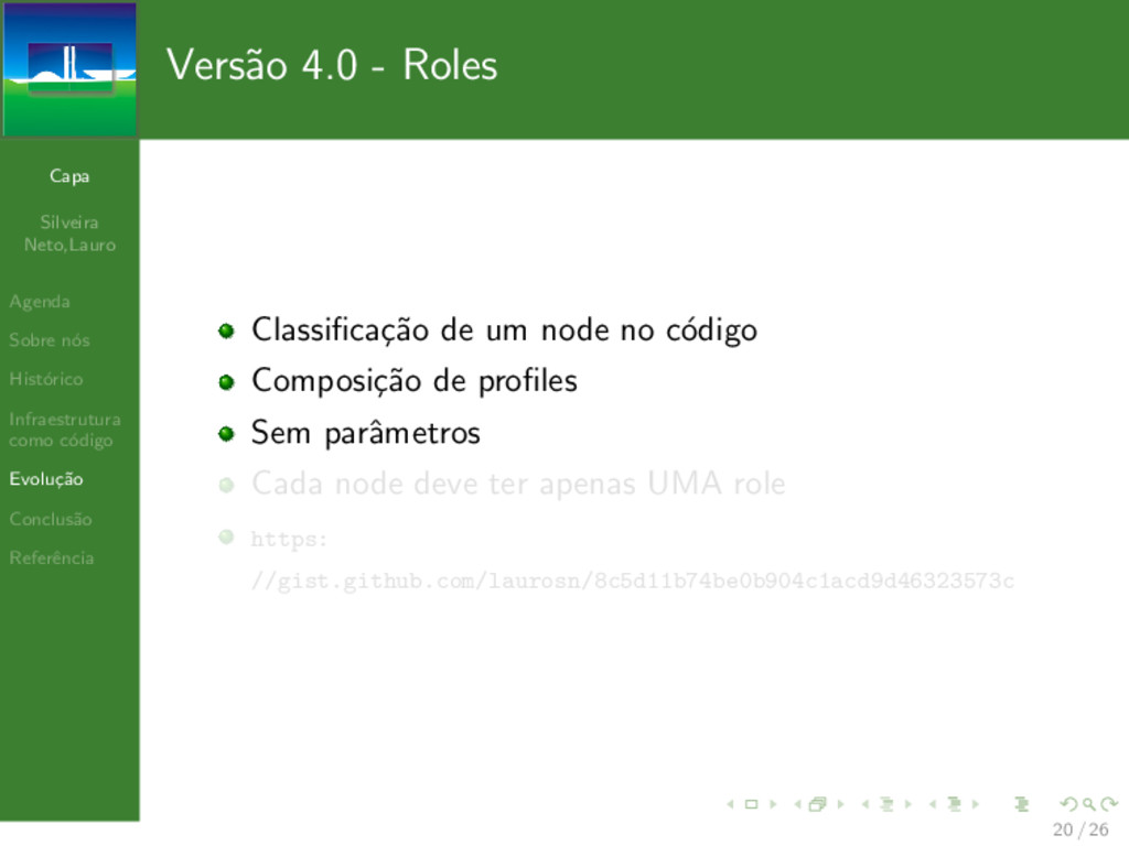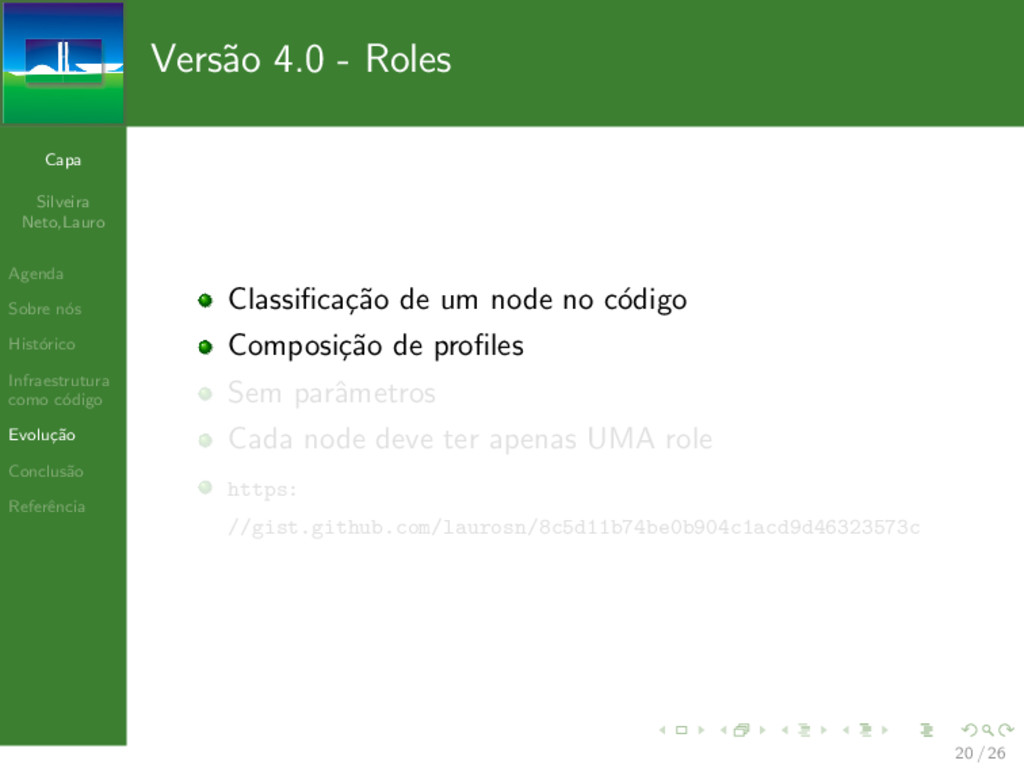 como c´ odigo Evolu¸ c˜ ao Conclus˜ ao Referˆ encia Vers˜ ao 4.0 - Roles Classifica¸ c˜ ao de um node no c´ odigo Composi¸ c˜ ao de profiles Sem parˆ ametros Cada node deve ter apenas UMA role https: //gist.github.com/laurosn/8c5d11b74be0b904c1acd9d46323573c 20 / 26
