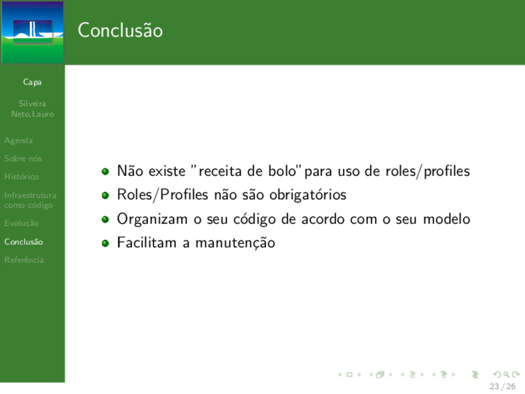 como c´ odigo Evolu¸ c˜ ao Conclus˜ ao Referˆ encia Conclus˜ ao N˜ ao existe ”receita de bolo”para uso de roles/profiles Roles/Profiles n˜ ao s˜ ao obrigat´ orios Organizam o seu c´ odigo de acordo com o seu modelo Facilitam a manuten¸ c˜ ao 23 / 26