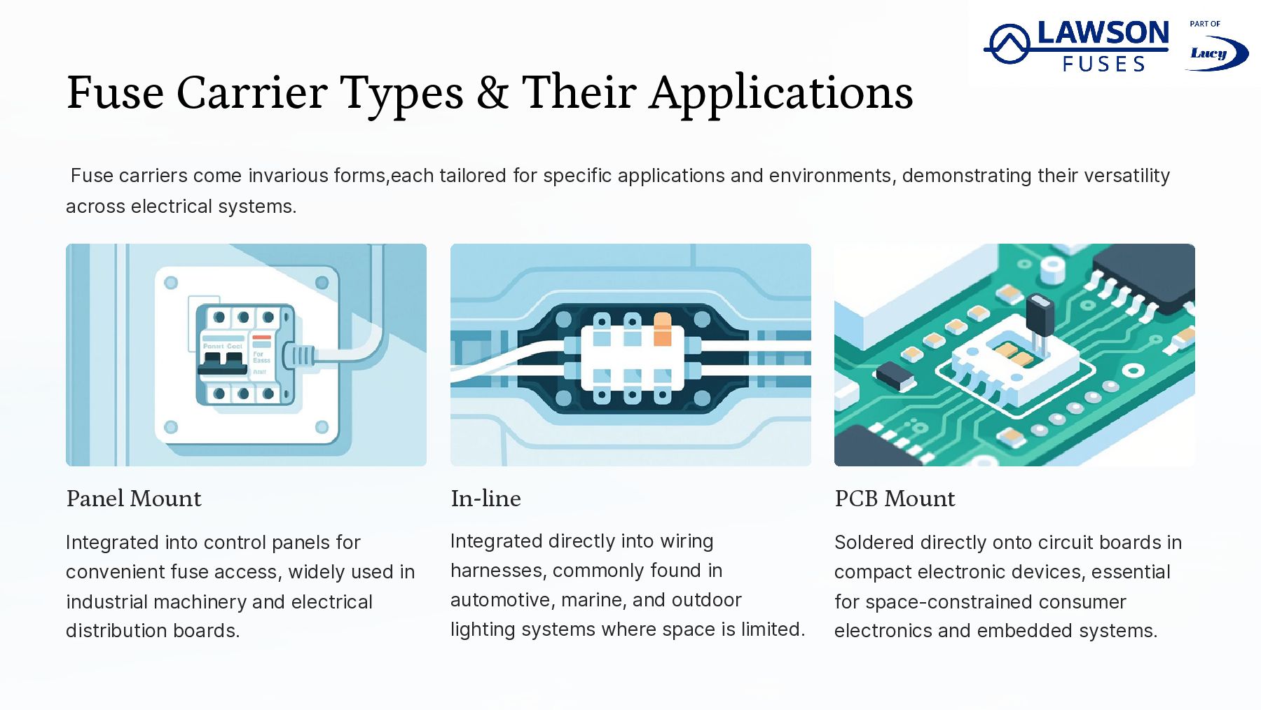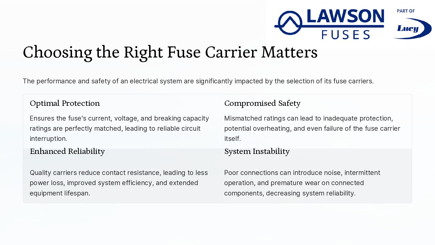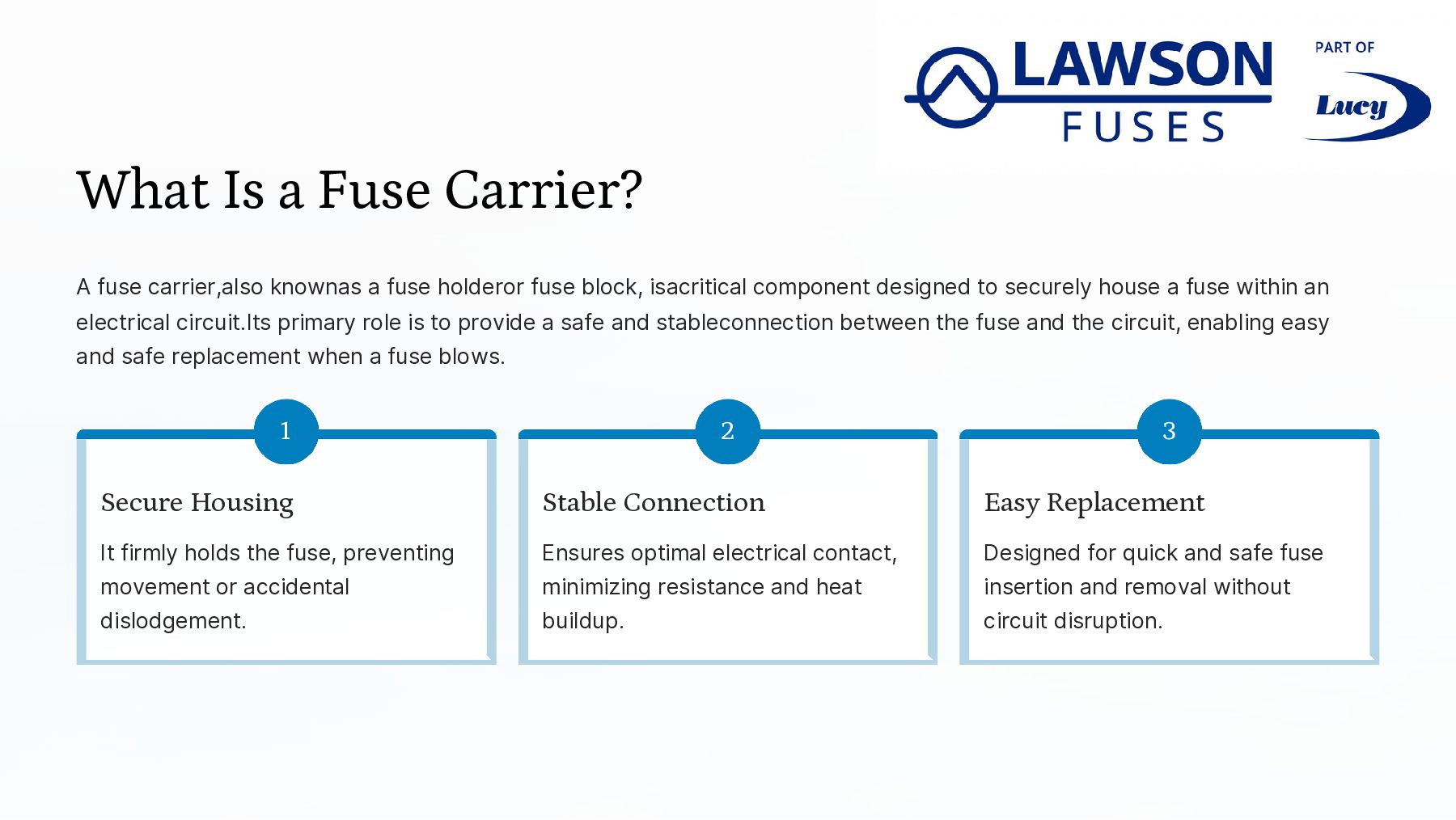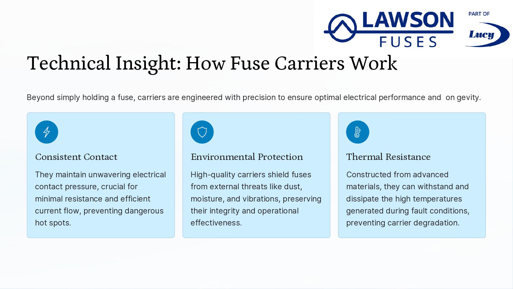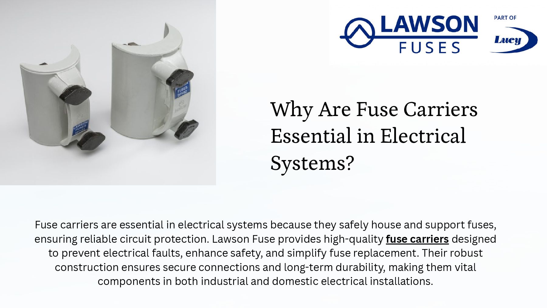 Fuse carriers are important components of electrical systems since they safely insulate and support fuses, thereby ensuring a reliable means of circuit protection. Lawson Fuse specifically designs fuse carriers for safety, to reduce the chance of an electrical failure, and enables easier and faster replacement of fuses. All materials used are of a high standard, and the fuse carriers are built for ruggedness with greater connections and durability over time. Fuse carriers are important components of both electrical industrial installations and domestic (home) electrical systems.