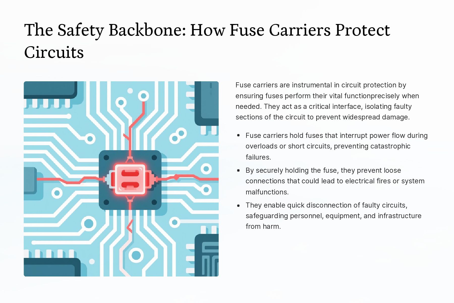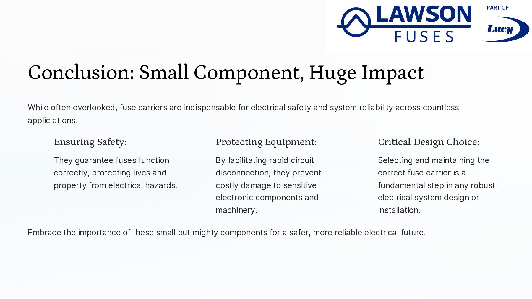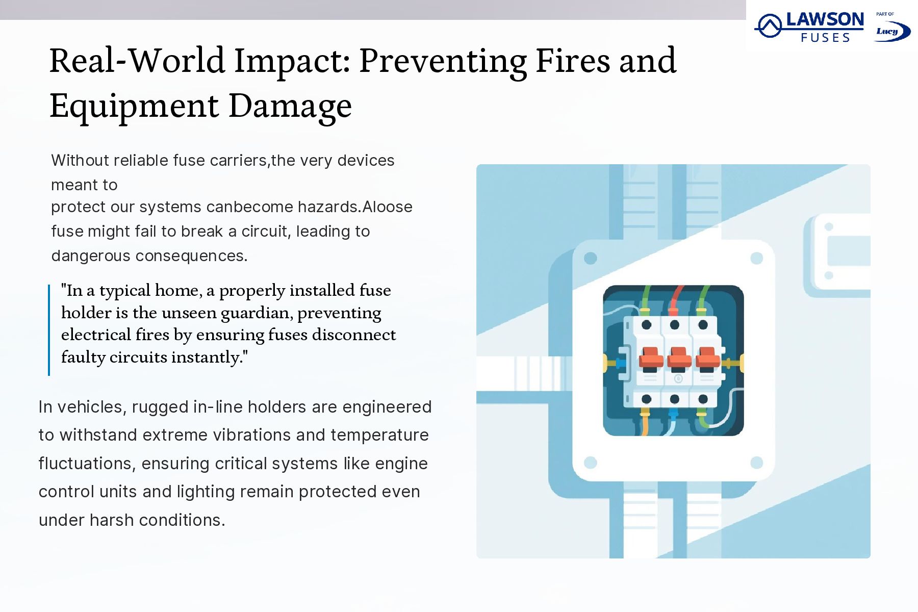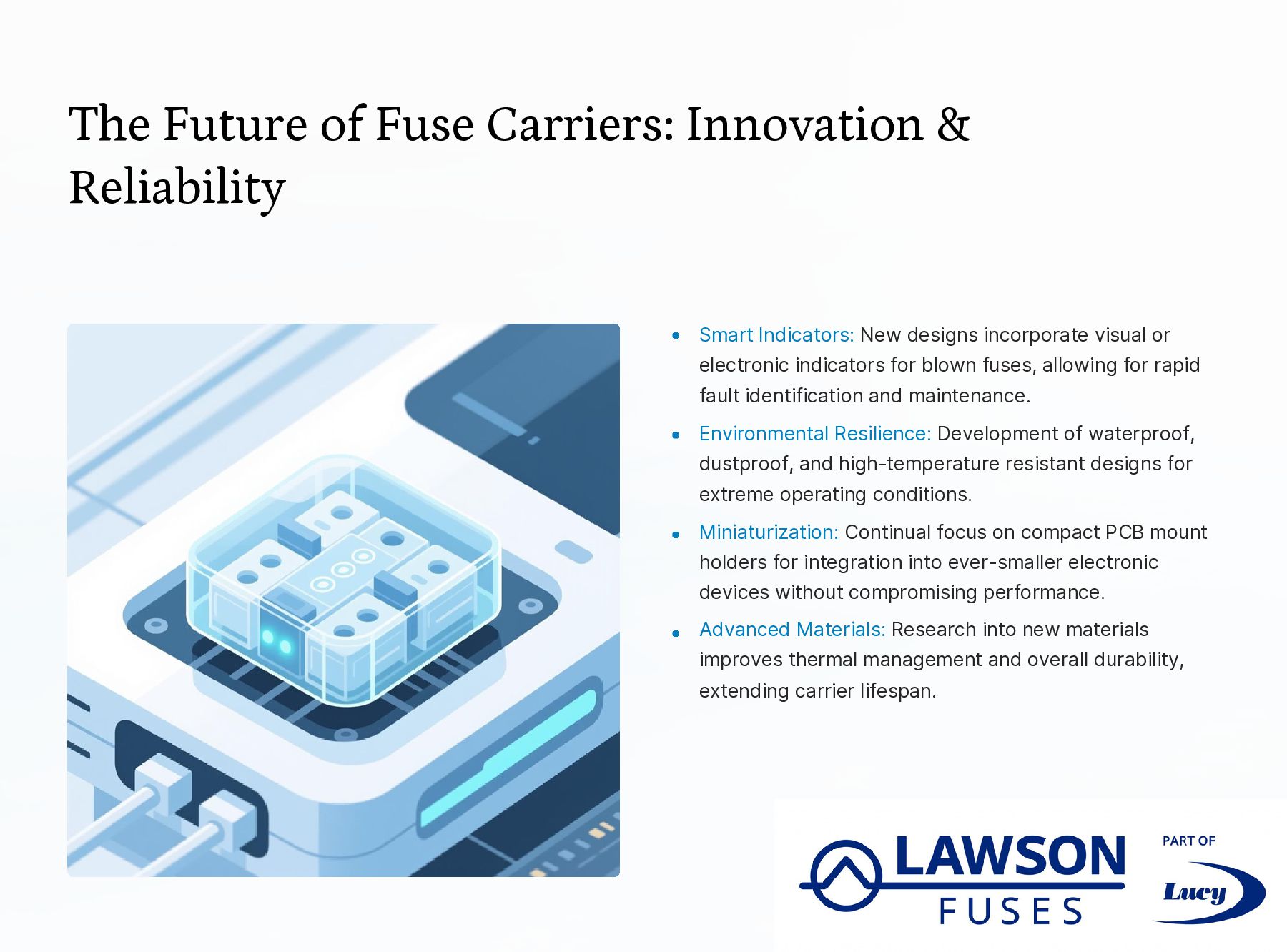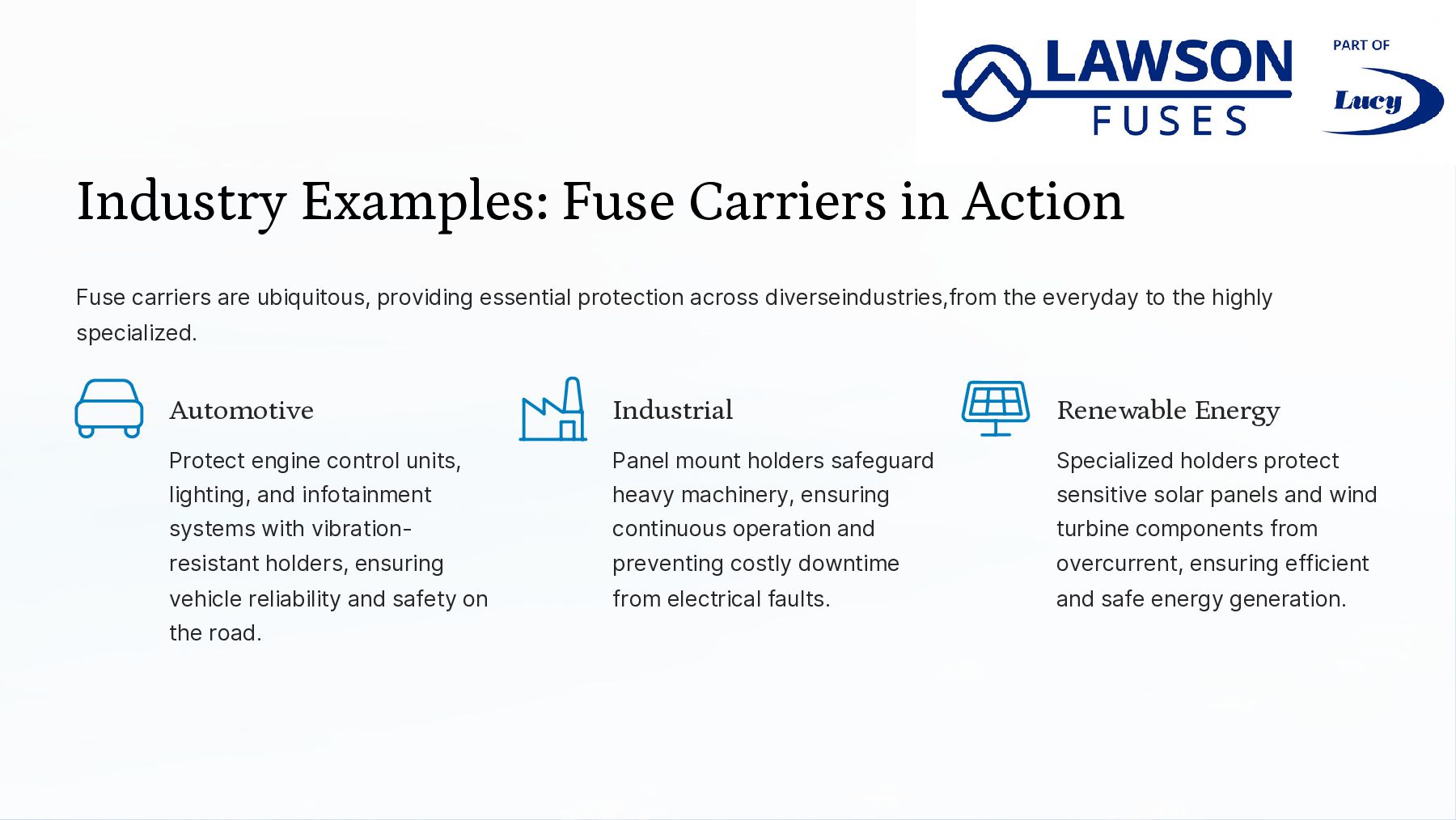 Fuse carriers are important components of electrical systems since they safely insulate and support fuses, thereby ensuring a reliable means of circuit protection. Lawson Fuse specifically designs fuse carriers for safety, to reduce the chance of an electrical failure, and enables easier and faster replacement of fuses. All materials used are of a high standard, and the fuse carriers are built for ruggedness with greater connections and durability over time. Fuse carriers are important components of both electrical industrial installations and domestic (home) electrical systems.