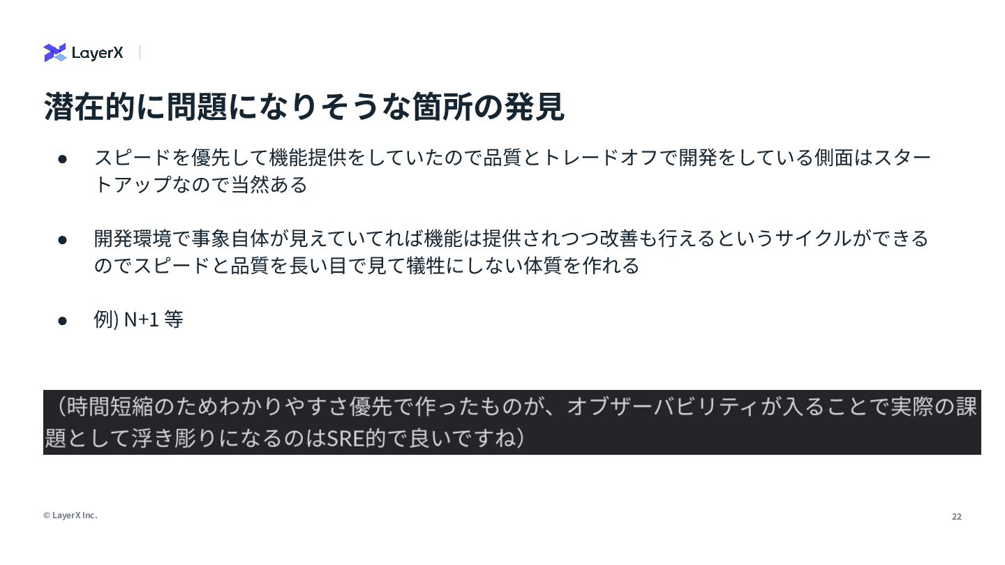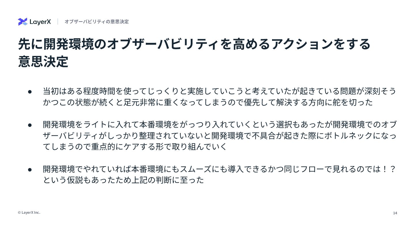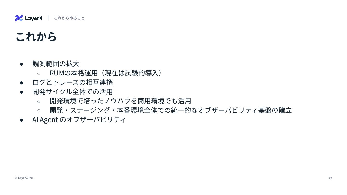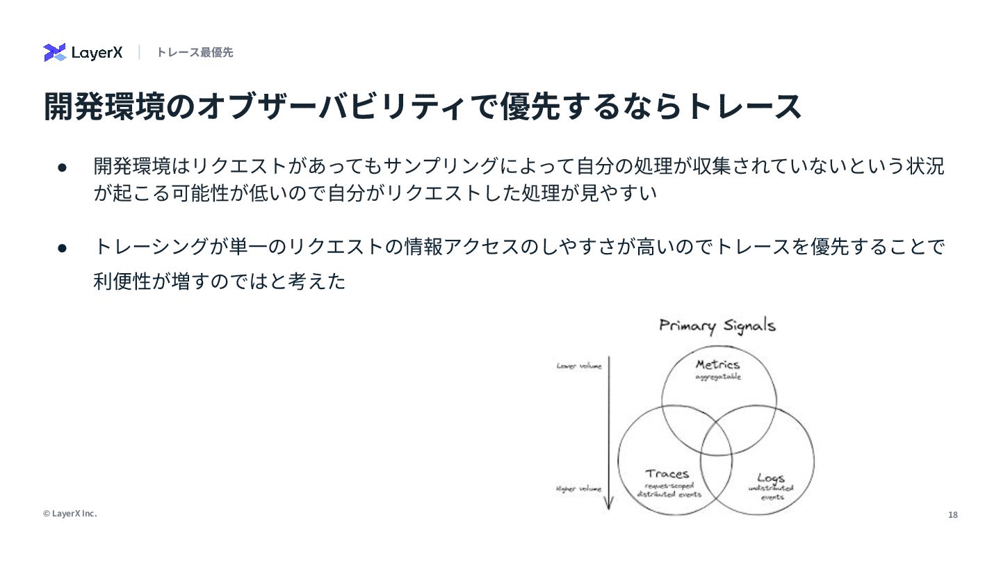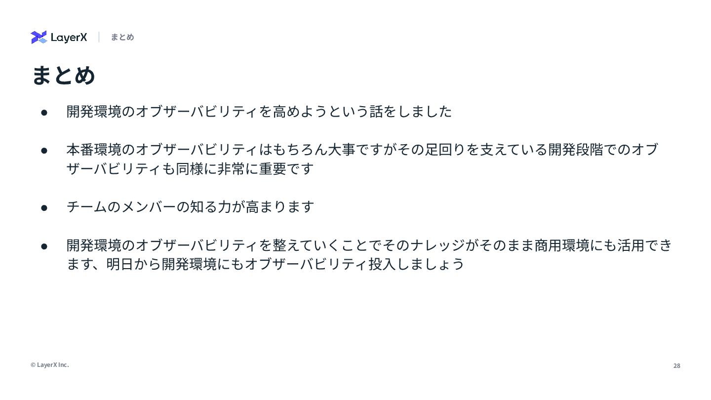 「本番環境のオブザーバビリティは大事」。誰もがそう言います。でも、日々の開発で「なんでこれ動かないんだ…」と途方に暮れた経験はありませんか?私たちは、開発環境こそオブザーバビリティ導入の第一歩だと信じ、私の所属するLayerXのAI・LLM事業部でその実践に挑んできました。