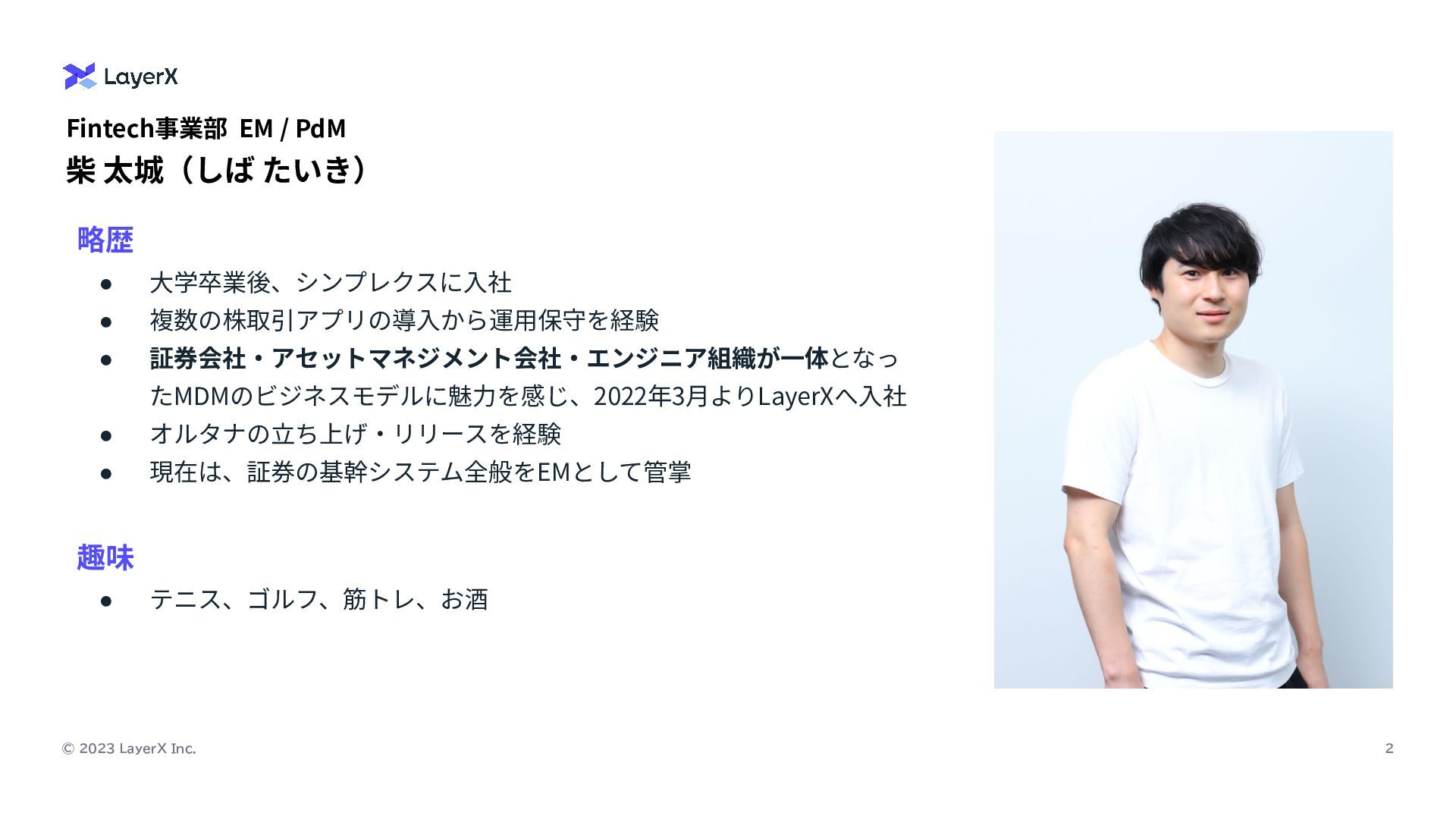 太城(しば たいき) 略歴 • ⼤学卒業後、シンプレクスに⼊社 • 複数の株取引アプリの導⼊から運⽤保守を経験 • 証券会社‧アセットマネジメント会社‧エンジニア組織が⼀体となっ たMDMのビジネスモデルに魅⼒を感じ、2022年3⽉よりLayerXへ⼊社 • オルタナの⽴ち上げ‧リリースを経験 • 現在は、証券の基幹システム全般をEMとして管掌 趣味 • テニス、ゴルフ、筋トレ、お酒