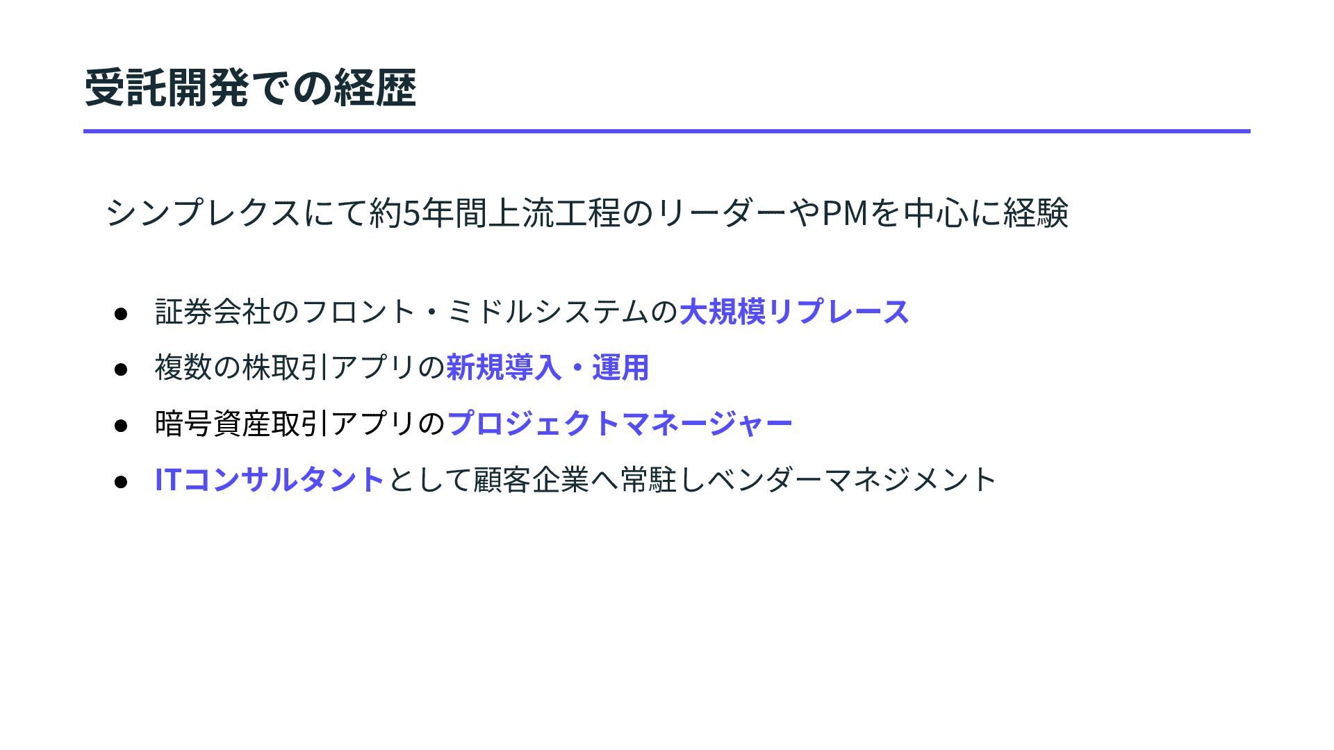 クライアン トの事業から⾃社の事業へ⽬線が変わっ ただけで、技術で事業に貢献する本質は 不変。 プロマネの普遍性: リスクを管理し確実 にデリバリーするプロジェクトマネジメ ント⼒は事業会社でも重要なスキル。 まとめ