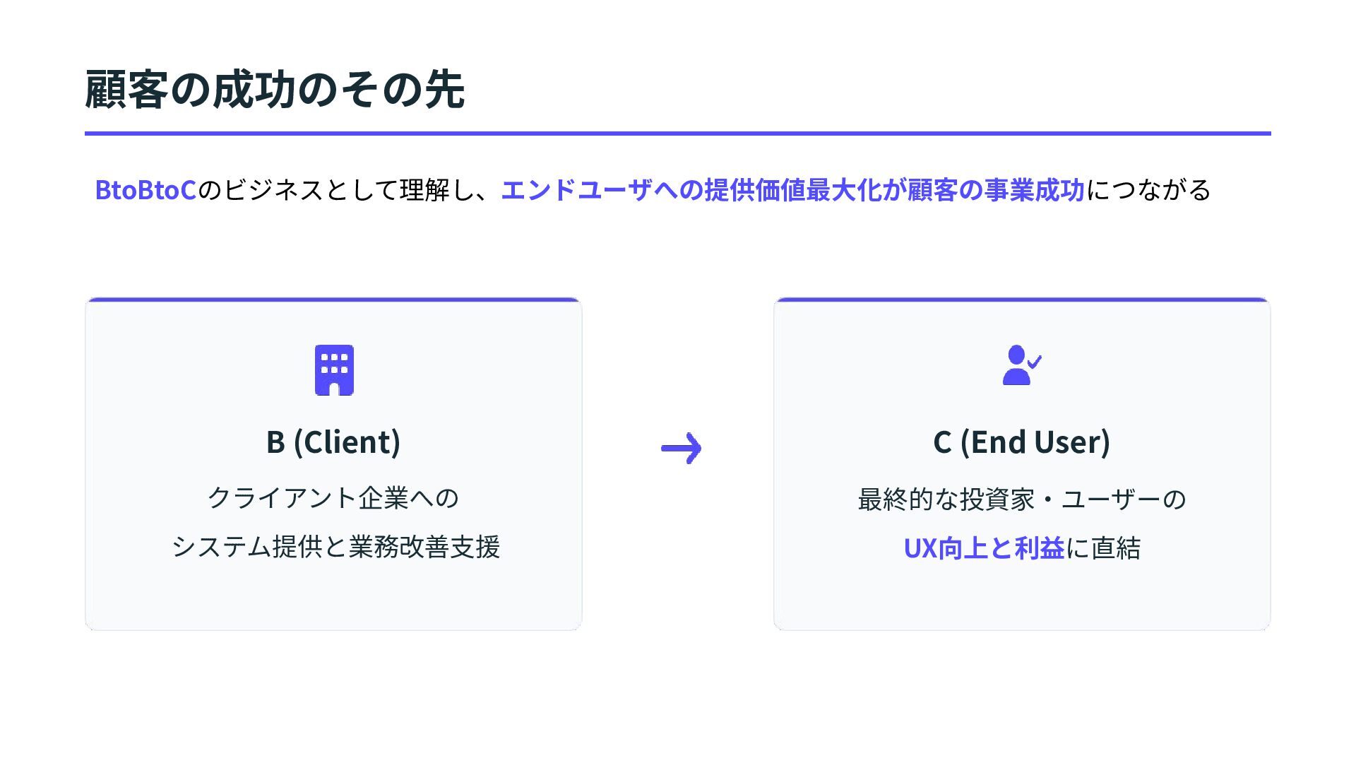 BtoBtoCのビジネスとして理解し、エンドユーザへの提供価値最⼤化が顧客の事業成功につながる