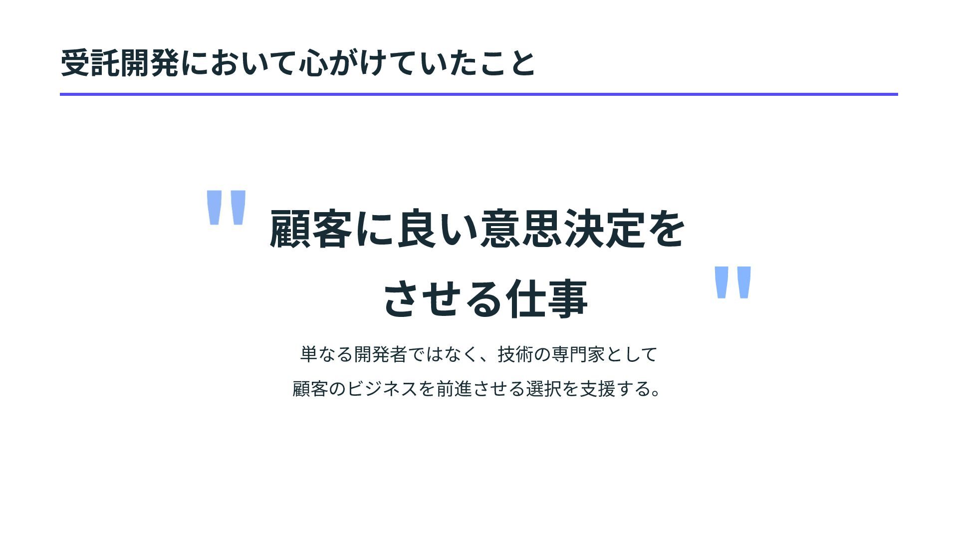6. 受託開発で得たスキル クライアントワーク: 顧客の課題を理解 し寄り添い解決ために伴⾛する 意思決定⽀援: 複雑な要件を整理し、決 断を促す合意形成⼒ キャッチアップ⼒: 様々な企業で様々な プロジェクトで即戦⼒として活躍する⼒