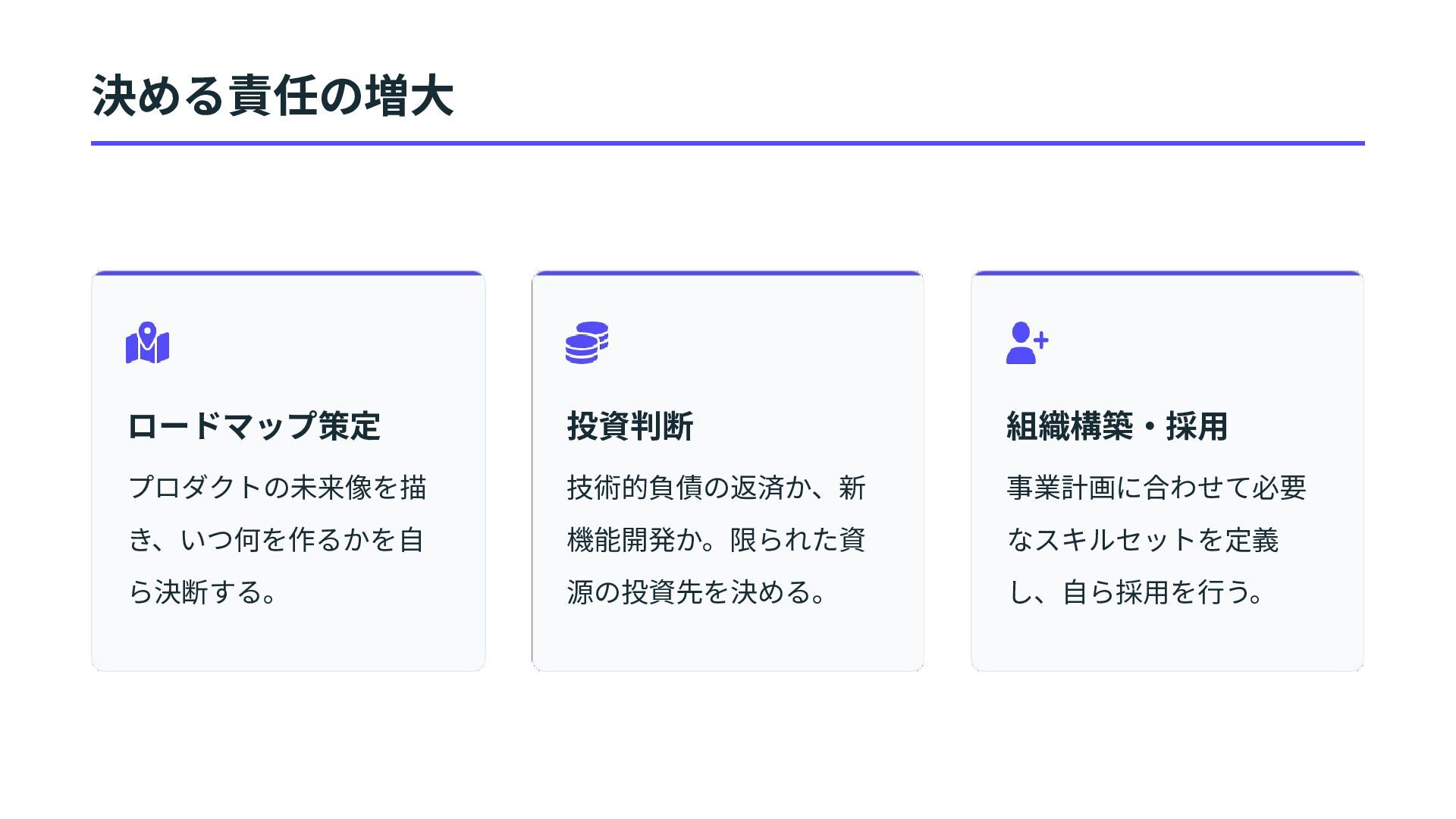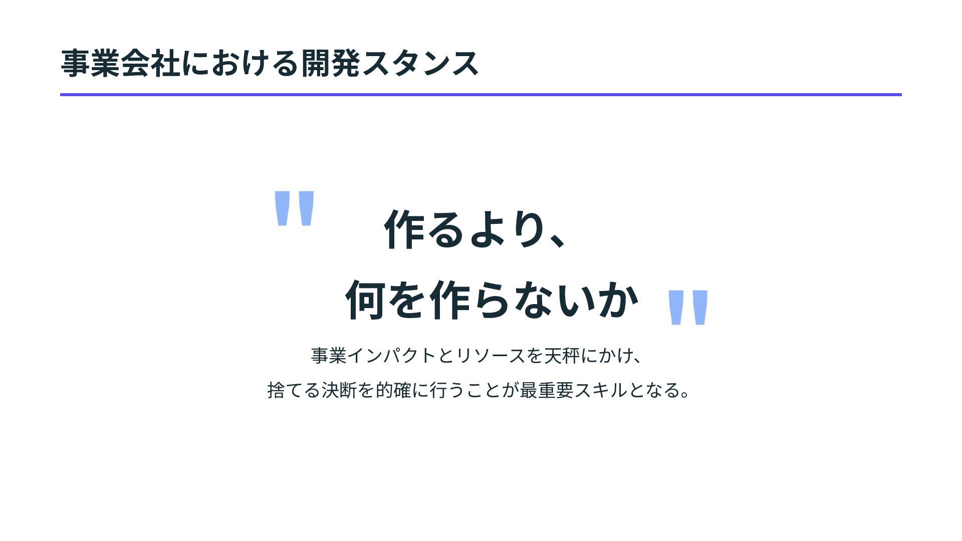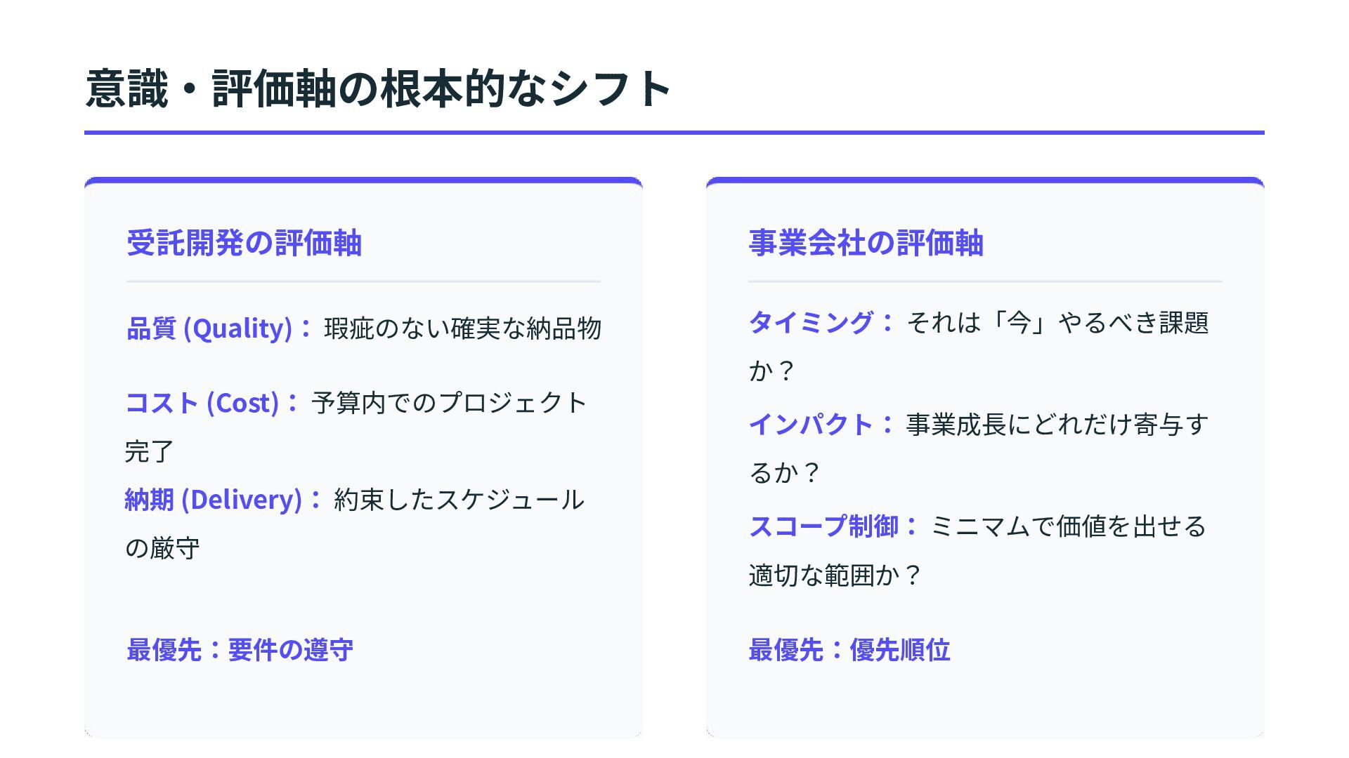 予算内でのプロジェクト 完了 最優先:要件の遵守 事業会社の評価軸 タイミング: それは「今」やるべき課題 か? インパクト: 事業成⻑にどれだけ寄与す るか? スコープ制御: ミニマムで価値を出せる 適切な範囲か? 最優先:優先順位 意識‧評価軸の根本的なシフト