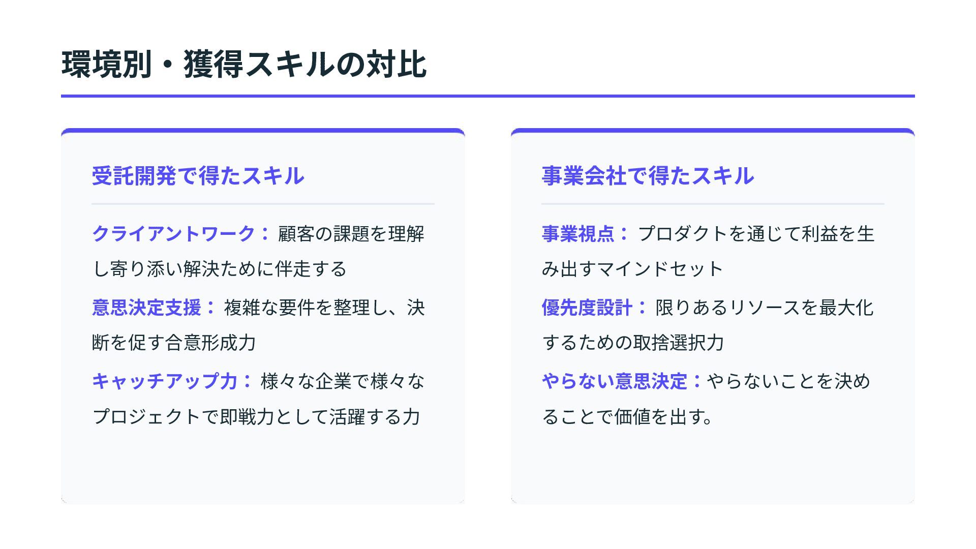 事業会社で得たスキル 事業視点: プロダクトを通じて利益を⽣ み出すマインドセット 優先度設計: 限りあるリソースを最⼤化 するための取捨選択⼒ やらない意思決定:やらないことを決め ることで価値を出す。 環境別‧獲得スキルの対⽐