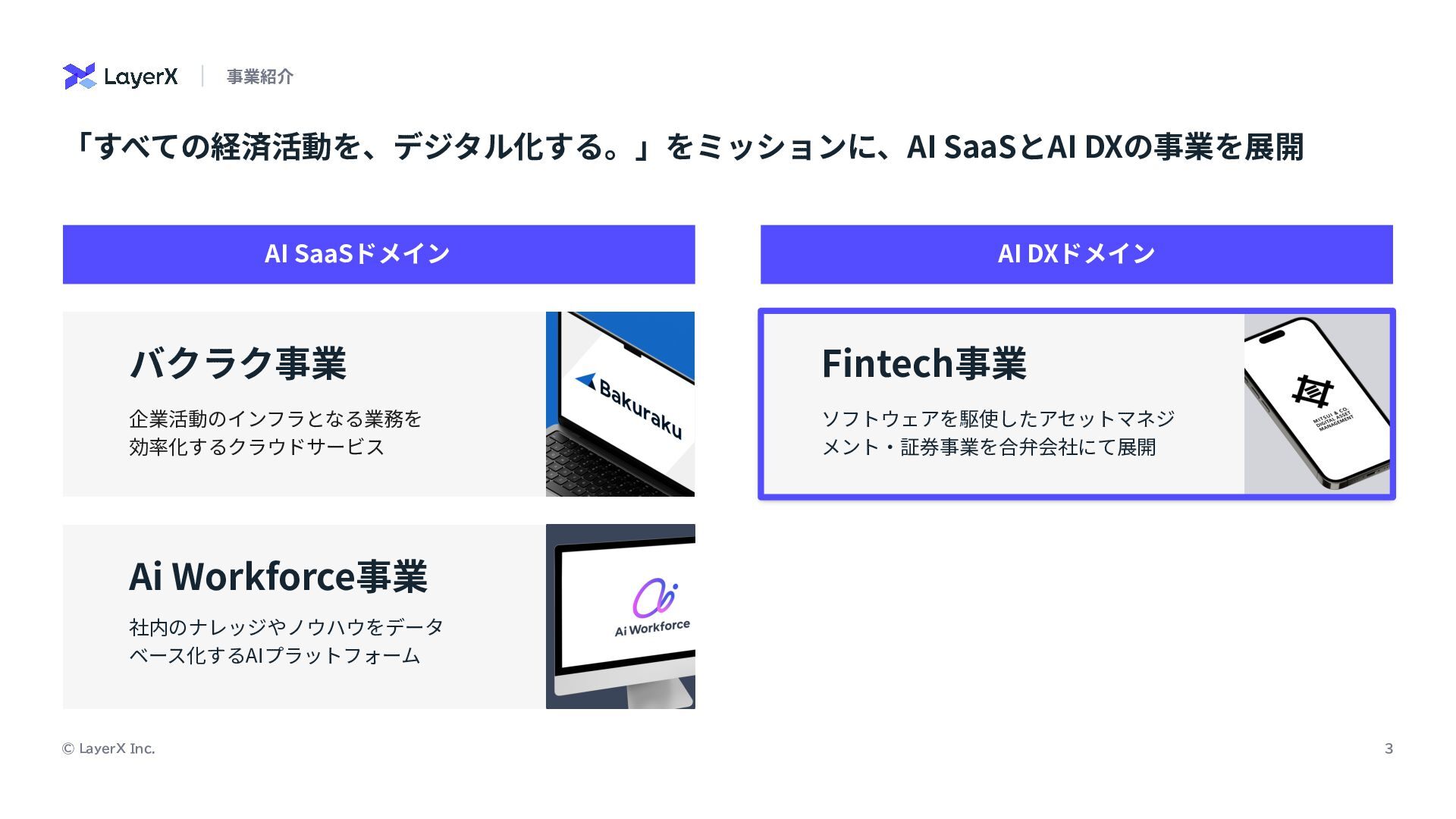 2. 3 © LayerX Inc. 「すべての経済活動を、デジタル化する。」をミッションに、AI SaaSとAI DXの事業を展開 事業紹介 バクラク事業 企業活動のインフラとなる業務を