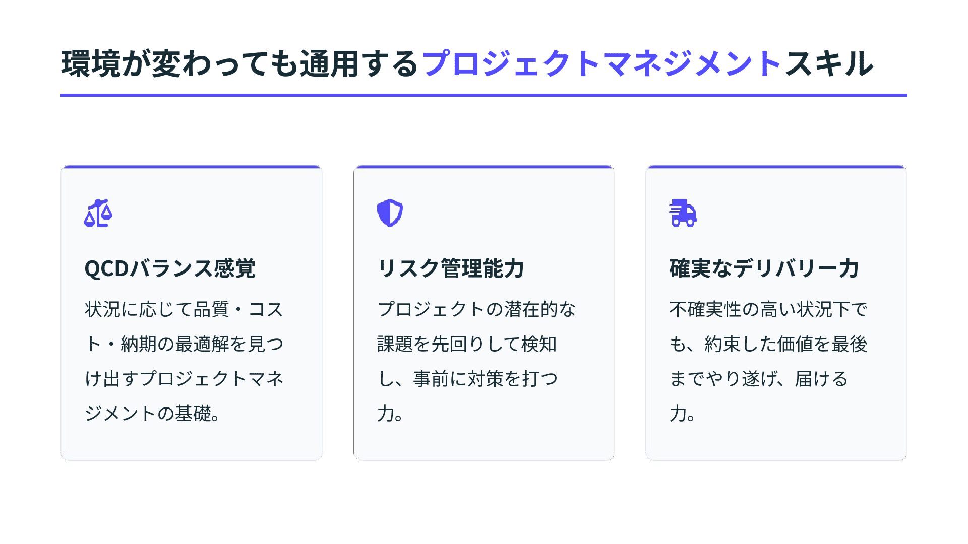 確実なデリバリー⼒ 不確実性の⾼い状況下で も、約束した価値を最後 までやり遂げ、届ける ⼒。 環境が変わっても通⽤するプロジェクトマネジメントスキル