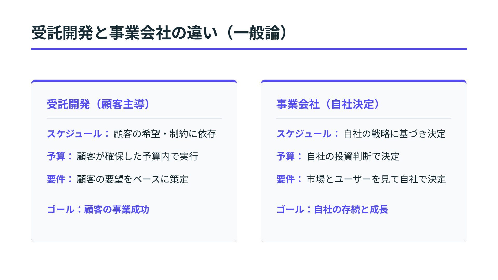 ⾃社の戦略に基づき決定 予算: ⾃社の投資判断で決定 要件: 市場とユーザーを⾒て⾃社で決定 ゴール:⾃社の存続と成⻑ 受託開発と事業会社の違い(⼀般論)