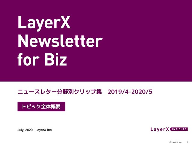 ブロックチェーンに関する国内外の先進トピックを紹介する「LayerX Newsletter」のうち、2019年4月〜2020年5月にかけて紹介したニュース(Biz編)を規制動向やデジタル通貨、電子契約、サプライチェーン等、12のカテゴリーに分類した分野別クリップ集(Biz編)を公開しました。
