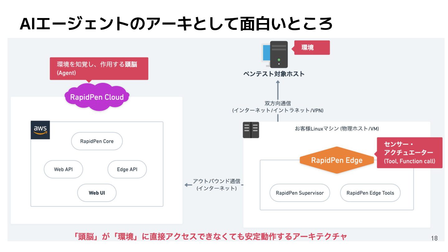 こと • テスト対象の脆弱性を突いて リモートログイン(制御を奪う) 侵入後、 • 侵入直後よりも強いユーザー 権限を奪う • 社内NWの他マシンに侵入 目的 「侵入される?」リスク把握 • 境界防御の弱点を探す • 権限昇格・横展開のスタートライン 「侵入されたら?」影響把握 • 社内NWの弱点を探す 特徴 • 境界防御は優先対策される → 定型では成功しづらい • 前調査 (偵察・列挙) を入念に、 小さな穴を高度に組合せて達成 • 社内NWは対策弱く、定型 ツール実行で成果出やすい • 初期侵入失敗し「仮にここか ら侵入されたら」で開始も (シナリオ信じられなくて対策に繋がらないがち) プレイ ヤー • セキュリティベンダー (人間) • 人間並のソフトウェアがない → RapidPen がAIで自動化 (AIエージェント技術で初めて可能になったとも言える) • セキュリティベンダー (人間) • ソフトウェア (定型/人間介入) (Pentera等, C2系, ツール系) 境界防御 6