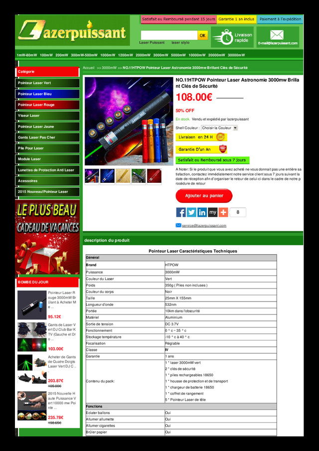 pour toutes les activités de plein air comme la randonnée, montrer les étoiles,Sa couleur verte sera visible de jour comme de nuit, laser stylo les parois d'escalade et autres activités du même type. Pour fonctionner, ce laser vert fonctionne avec des batteries haute capacité 18650 pour une durée de fonctionnement plus longue. Détails et Avantages Pointeur Laser Vert : Pointeur laser vert est très commun aujourd'hui. Ce est un laser extrêmement puissant, doté de très belles finitions, plus proche du sab re laser que du stylo laser ! Voulez-vous acheter la hâte, ne manquez pas l'occasion de voyager, des prix bas pour acheter des biens d e haute qualité, vous avez certainement mérité!La même puissance meilleur prix, le, valeur la plus rentable pour l'argent. 1. Ces pointeurs sont utiles pour les enseignants en classe ou une réunion.Super Pointeur Laser LED est aussi montré comme une ét oile dans le ciel, dans le ciel peut montrer la vraie star est un merveilleux cadeau. 2. Économie d'énergie, léger, adapté pour mettre dans votre poche ou sac à main. Lampe de poche laser peut être utilisé pour l'afficha ge, de l'éducation et de divertissement et de plusieurs indicateurs. 3. Assez de puissance, vous pouvez pointer matchs. 4. Le vert pointeur laser de haute qualité, très approprié pour le club utilisation de l'astronomie, de l'aventure en plein air, allumage, all ume-cigare,vous pouvez également l'auto-défense. 5. Puissant 3000mw pointeur laser vert , vous pouvez spécifier les étoiles dans le ciel, dessiner constellation, en plus, ce laser pointeur vert est livré avec cinq têtes, vous pouvez voir cinq des effets de lumière différents.Ceci est également le meilleur outil pour la fabricatio n d'une atmosphère romantique. 6. Notre ce laser vert 3000mW est le meilleur vendu de tous stylo laser pointeur laser prix moins cher, d'un. 100% d'assurance de la q ualité!