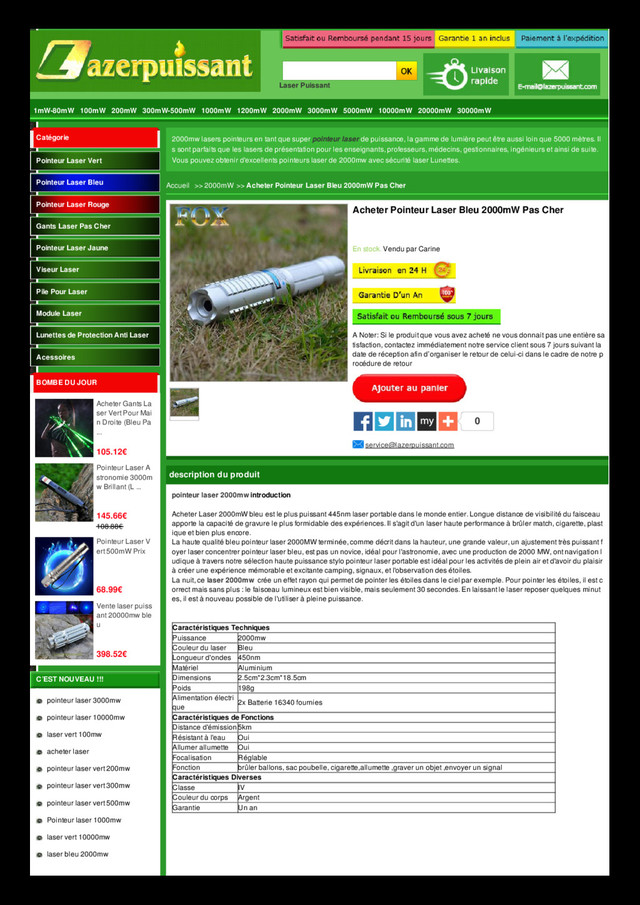 5000mW 10000mW 20000mW 30000mW Pointeur Laser Vert Pointeur Laser Bleu Pointeur Laser Rouge Gants Laser Pas Cher Pointeur Laser Jaune Viseur Laser Pile Pour Laser Module Laser Lunettes de Protection Anti Laser Acessoires Catégorie Acheter Gants La ser Vert Pour Mai n Droite (Bleu Pa ... 105.12€ Pointeur Laser A stronomie 3000m w Brillant (L ... 145.66€ 108.88€ Pointeur Laser V ert 500mW Prix 68.99€ Vente laser puiss ant 20000mw ble u 398.52€ BOMBE DU JOUR C’EST NOUVEAU !!! pointeur laser 3000mw pointeur laser 10000mw laser vert 100mw acheter laser pointeur laser vert 200mw pointeur laser vert 300mw pointeur laser vert 500mw Pointeur laser 1000mw laser vert 10000mw laser bleu 2000mw 0 Acheter Pointeur Laser Bleu 2000mW Pas Cher En stock. Vendu par Carine A Noter: Si le produit que vous avez acheté ne vous donnait pas une entière sa tisfaction, contactez immédiatement notre service client sous 7 jours suivant la date de réception afin d’organiser le retour de celui-ci dans le cadre de notre p rocédure de retour