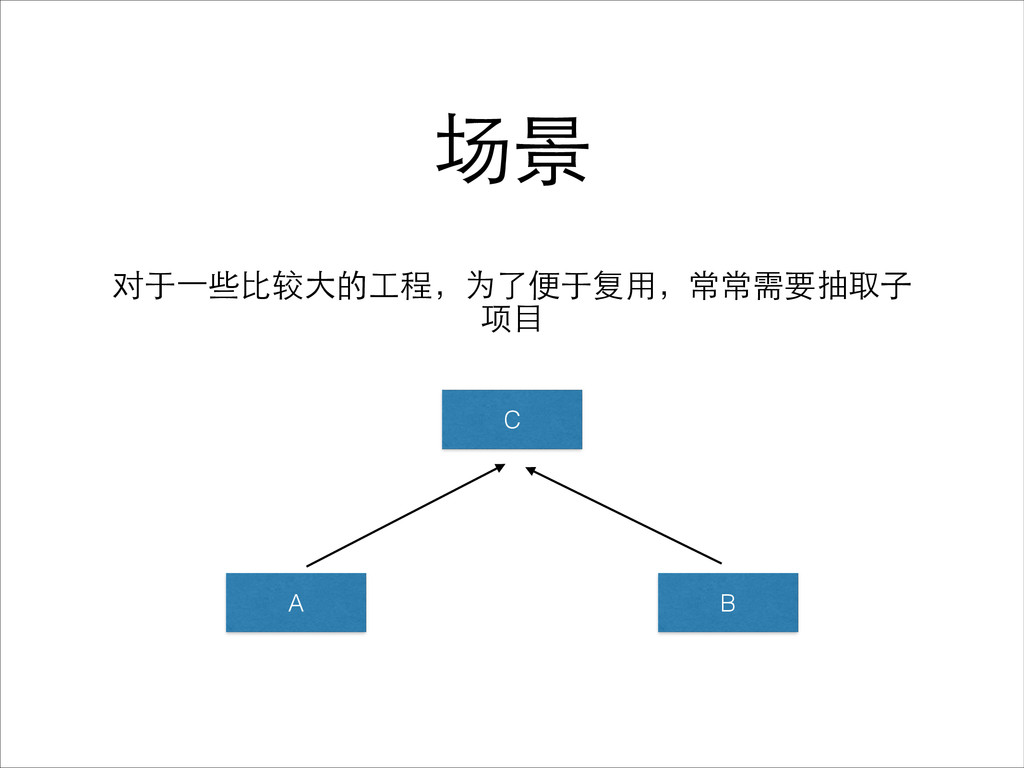 场景 对于⼀一些⽐比较⼤大的⼯工程,为了便于复⽤用,常常需要抽取⼦子 项⺫⽬目 A B C