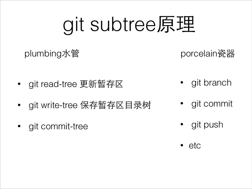 • git commit-tree porcelain瓷器 • git branch • git commit • git push • etc plumbing⽔水管