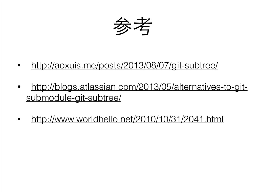 参考 • http://aoxuis.me/posts/2013/08/07/git-subtree/ • http://blogs.atlassian.com/2013/05/alternatives-to-git- submodule-git-subtree/ • http://www.worldhello.net/2010/10/31/2041.html