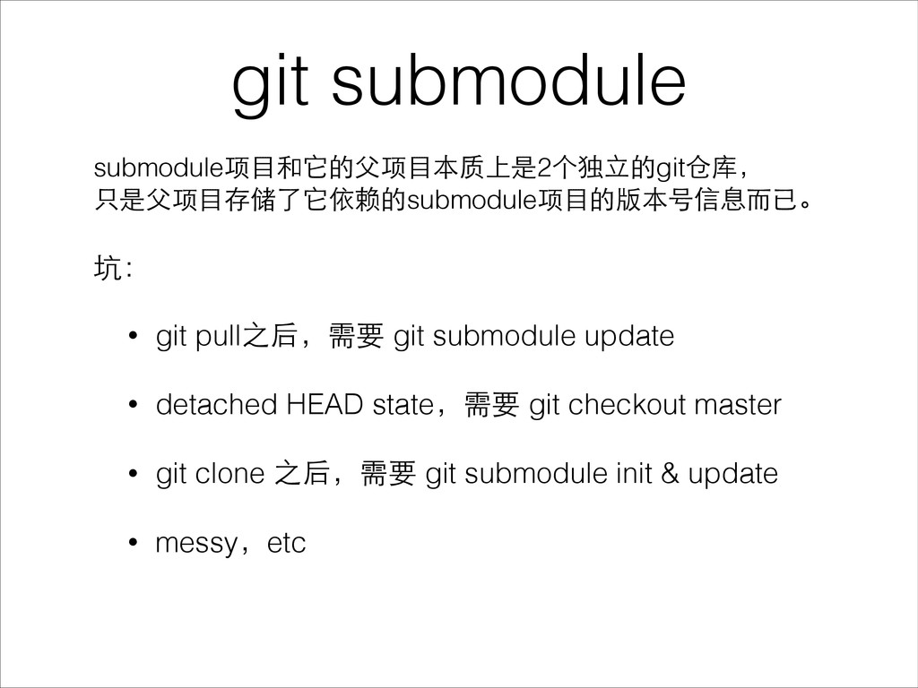 update • detached HEAD state,需要 git checkout master • git clone 之后,需要 git submodule init & update • messy,etc