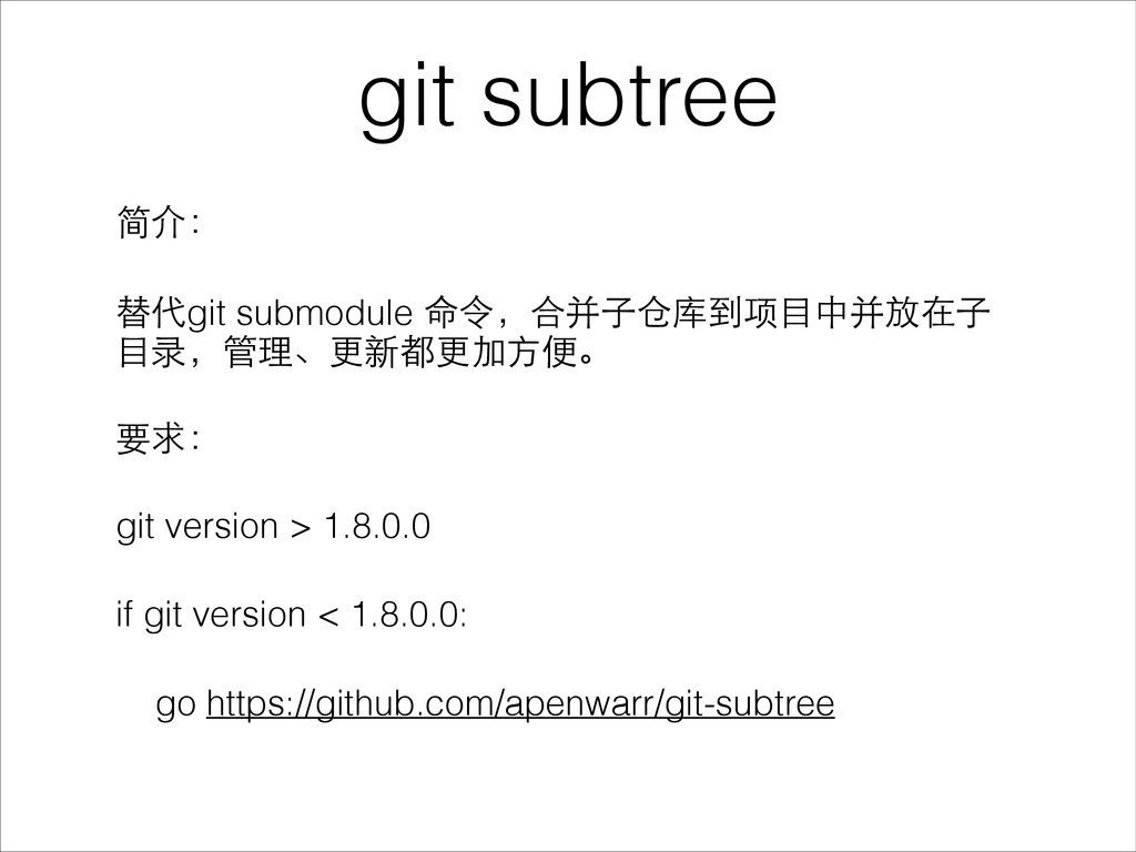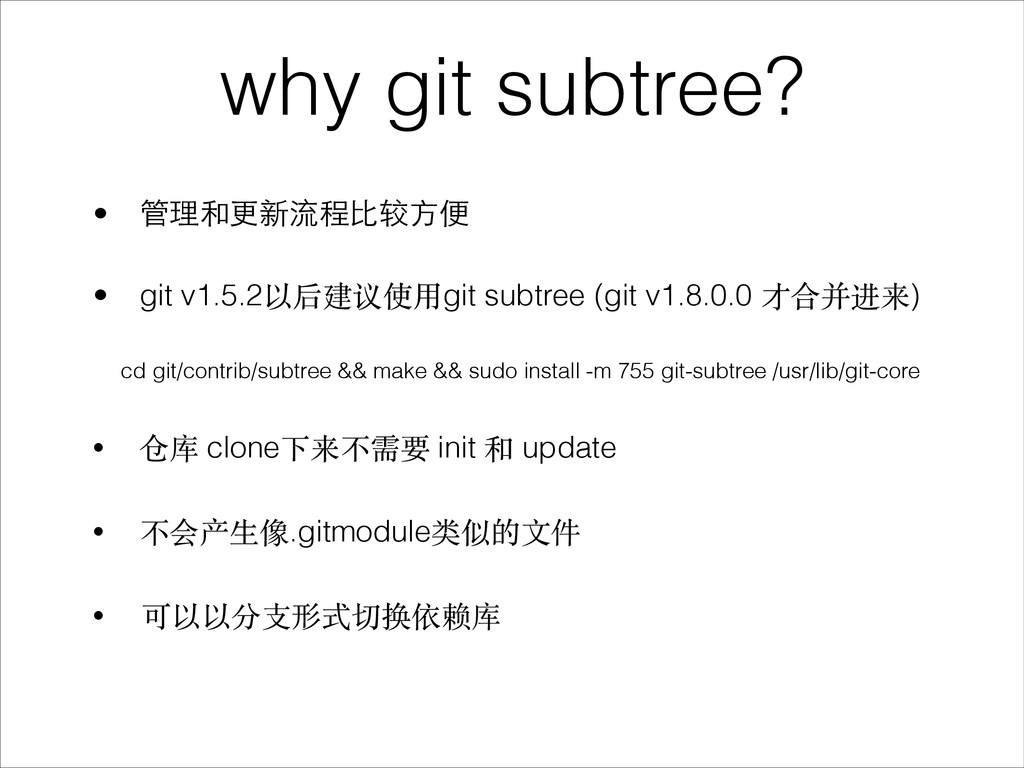 v1.8.0.0 才合并进来) cd git/contrib/subtree && make && sudo install -m 755 git-subtree /usr/lib/git-core • 仓库 clone下来不需要 init 和 update • 不会产⽣生像.gitmodule类似的⽂文件 • 可以以分⽀支形式切换依赖库