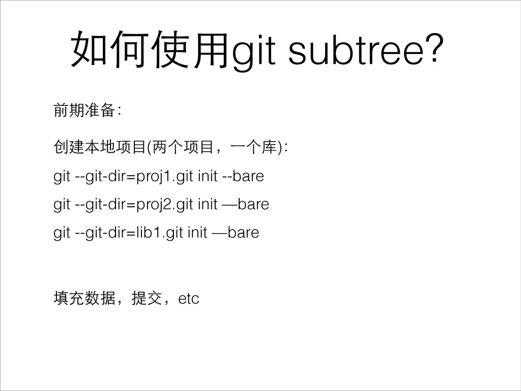 --git-dir=proj2.git init —bare git --git-dir=lib1.git init —bare ! ! 填充数据,提交,etc