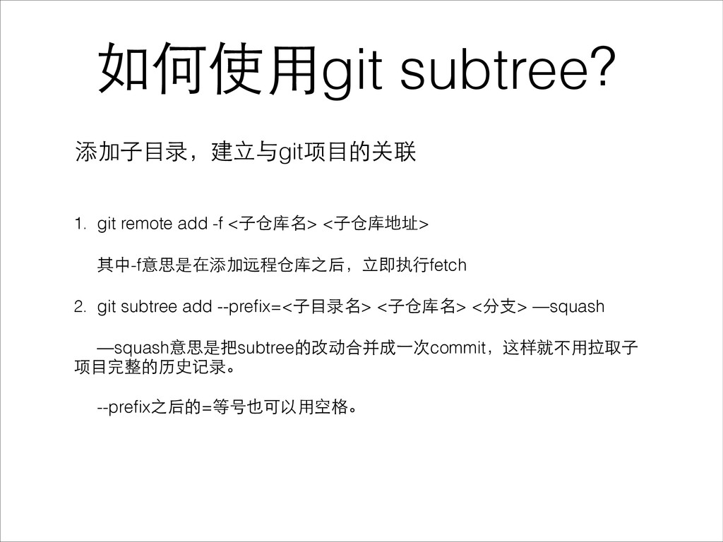<⼦子仓库地址> ! 其中-f意思是在添加远程仓库之后,⽴立即执⾏行fetch ! 2. git subtree add --prefix=<⼦子⺫⽬目录名> <⼦子仓库名> <分⽀支> —squash ! —squash意思是把subtree的改动合并成⼀一次commit,这样就不⽤用拉取⼦子 项⺫⽬目完整的历史记录。 ! --prefix之后的=等号也可以⽤用空格。 ! ! 添加⼦子⺫⽬目录,建⽴立与git项⺫⽬目的关联