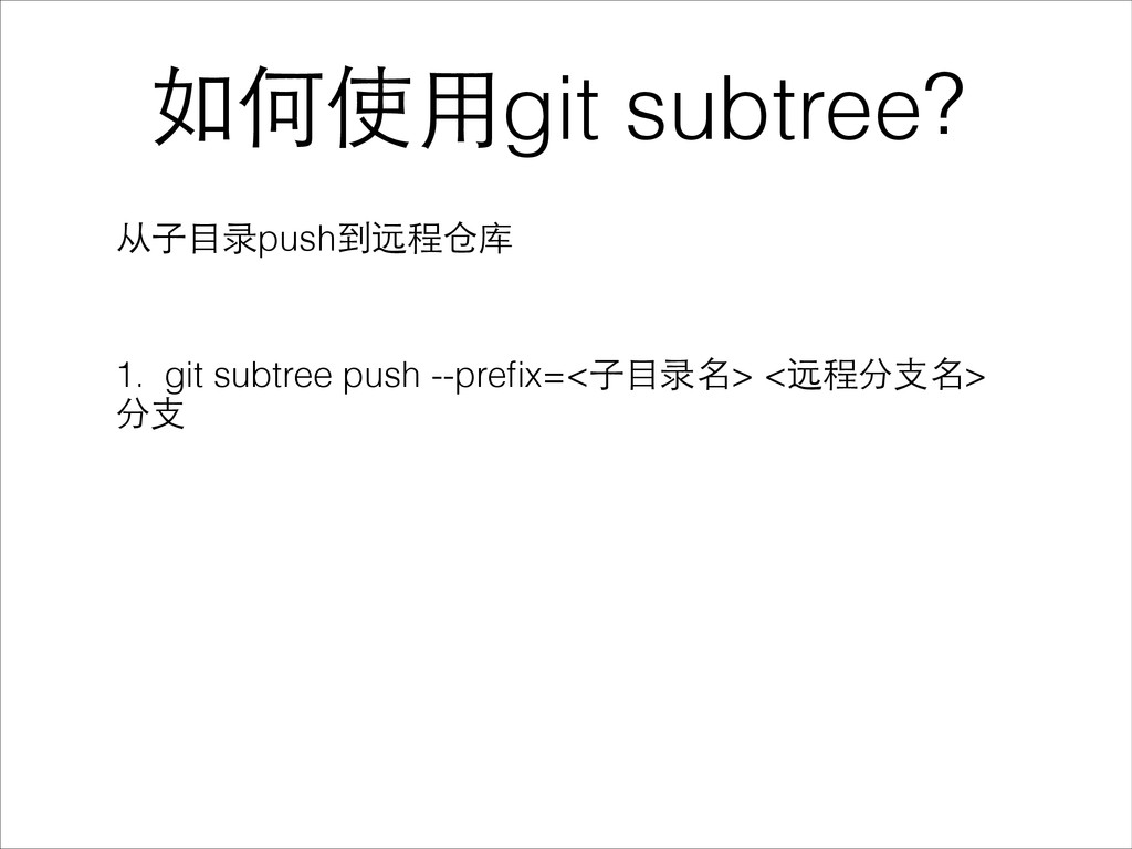 如何使⽤用git subtree? ! ! 1. git subtree push --prefix=<⼦子⺫⽬目录名> <远程分⽀支名>