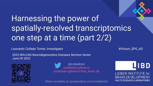 Weber @stephaniehicks Stephanie C Hicks @abspangler Abby Spangler @martinowk Keri Martinowich @CerceoPage Stephanie C Page @kr_maynard Kristen R Maynard @lcolladotor Leonardo Collado-Torres @Nick-Eagles (GH) Nicholas J Eagles Kelsey D Montgomery Sang Ho Kwon Image Analysis Expression Analysis Data Generation Thomas M Hyde @lahuuki Louise A Huuki-Myers @BoyiGuo Boyi Guo @mattntran Matthew N Tran @sowmyapartybun Sowmya Parthiban Slides available at speakerdeck.com /lcolladotor + Many more LIBD, JHU, and external collaborators @mgrantpeters Melissa Grant-Peters @prashanthi-ravichandran (GH) Prashanthi Ravichandran