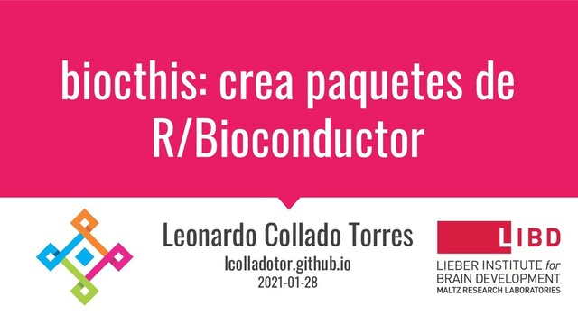 Abre RStudio (con R 4.0.x) 2. Instala BiocManager: install.packages("BiocManager") 3. Instala biocthis: BiocManager::install("biocthis") 4. Crea tu paquete: usethis::create_package("biocthistest") 5. Agrega los 4 scripts de prueba: biocthis::use_bioc_pkg_templates() 6. Empieza con el primer script de R en biocthistest/dev https://lcolladotor.github.io/biocthis/