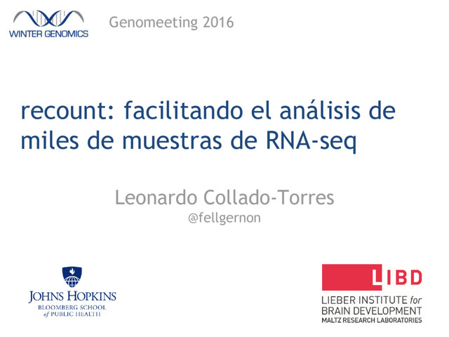lo largo de la vida en los cerebros de los humanos 1. derfinder permite descubrir regions diferencialmente expresadas y pegadas 2. Identificamos regiones que cambian su expresión en el cerebro 3. Creamos herramientas para compartir reportes reproducibles 4. Vía recount se pueden usar estas herramientas para analizar 2,040 projectos públicos