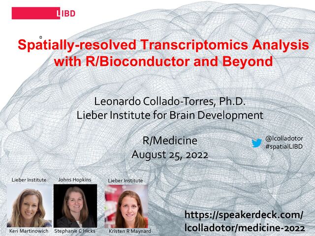 L4 L3 L2 L1 SFAR I ASC 102 ASD 53 D D ID 49 D E.U p D E.D ow n 2.7 2.1 2.7 4 3.6 4.9 4.5 2.5 5 2.8 5 6.4 2.8 ASD WM L6 L5 L4 L3 L2 L1 PE.U p PE.D ow n BS2.U p BS2.D ow n BS2.U p BS2.D ow n PE.U p PE.D 2.1 2 3.1 1.8 2.2 1.8 8.8 5 2.7 2.6 4.6 SCZD−DE SCZD−TW (A) (B) DIY at http://spatial.libd.org/spatialLIBD/ Laminar-enrichment of clinical gene sets Autism Spectrum Disorder (ASD) • SFARI: Abrahams et al, Mol Autism, 2013 • ASC102: Satterstrom et al, Cell, 2020 Break up into: • ASD53: ASD dominant traits • DDID49: neurodevelopmental delay COLOR is significance (-log10[p]) NUMBER is enrichment (odds ratio) 25 Maynard, Collado-Torres, et al, Nat Neuro, 2021
