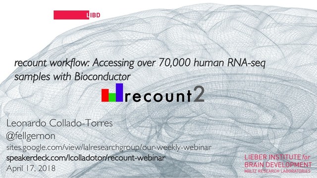 to - develop methods to process and analyze data from recount2 - use recount2 to address specific biological questions This project involves the Hansen, Leek, Langmead and Battle labs at JHU Contact: Kasper D. Hansen ([email protected] | www.hansenlab.org) Code for making a 5 min video on recount2: github.com/lcolladotor/biopeerprize2018
