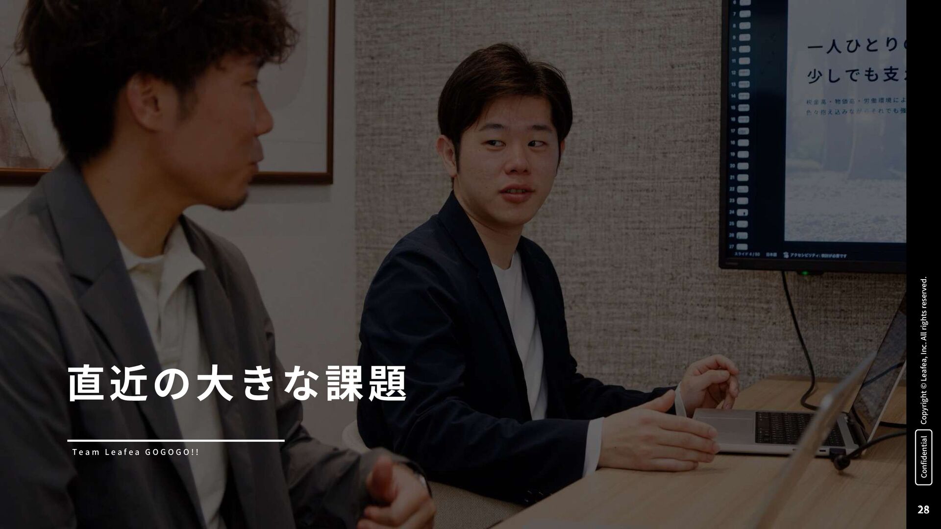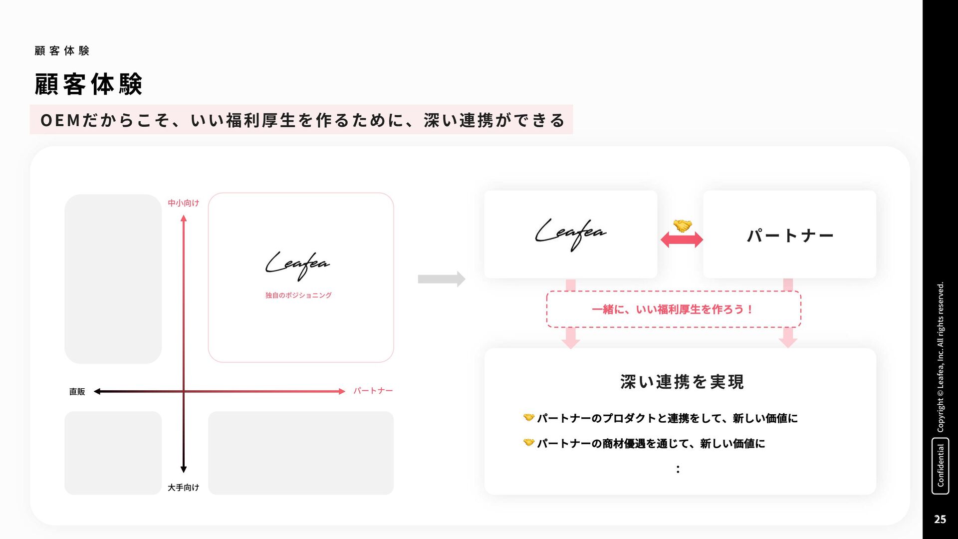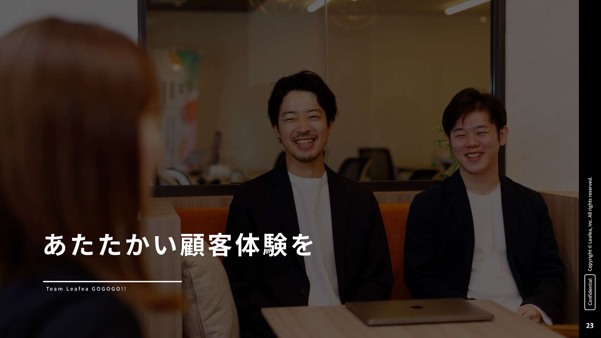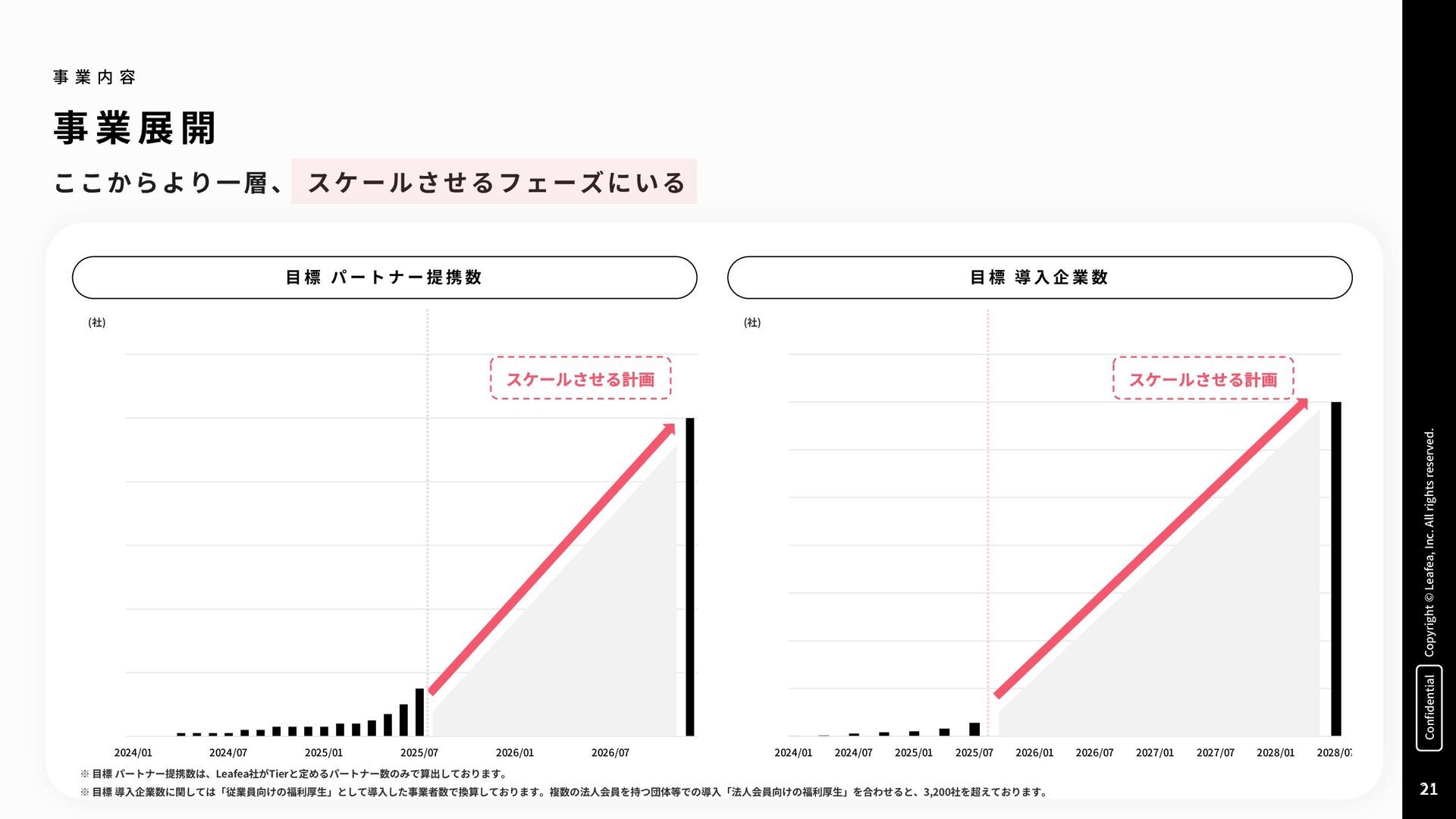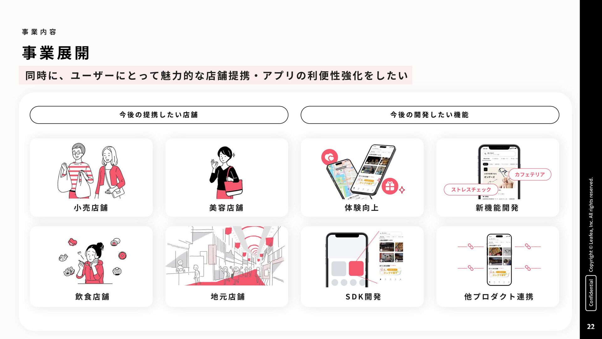 標 パ ー ト ナ ー 提 携 数 21 事 業 内 容 事 業 展 開 ※ ⽬標 パートナー提携数は、Leafea社がTierと定めるパートナー数のみで算出しております。 ※ ⽬標 導⼊企業数に関しては「従業員向けの福利厚⽣」として導⼊した事業者数で換算しております。複数の法⼈会員を持つ団体等での導⼊「法⼈会員向けの福利厚⽣」を合わせると、3,200社を超えております。 (社) ⽬ 標 導 ⼊ 企 業 数 ここからより⼀層、 スケールさせるフェーズにいる (社) 0 20 40 60 80 100 120 2024/01 2024/07 2025/01 2025/07 2026/01 2026/07 0 5,000 10,000 15,000 20,000 25,000 30,000 35,000 40,000 2024/01 2024/07 2025/01 2025/07 2026/01 2026/07 2027/01 2027/07 2028/01 2028/07 スケールさせる計画 スケールさせる計画