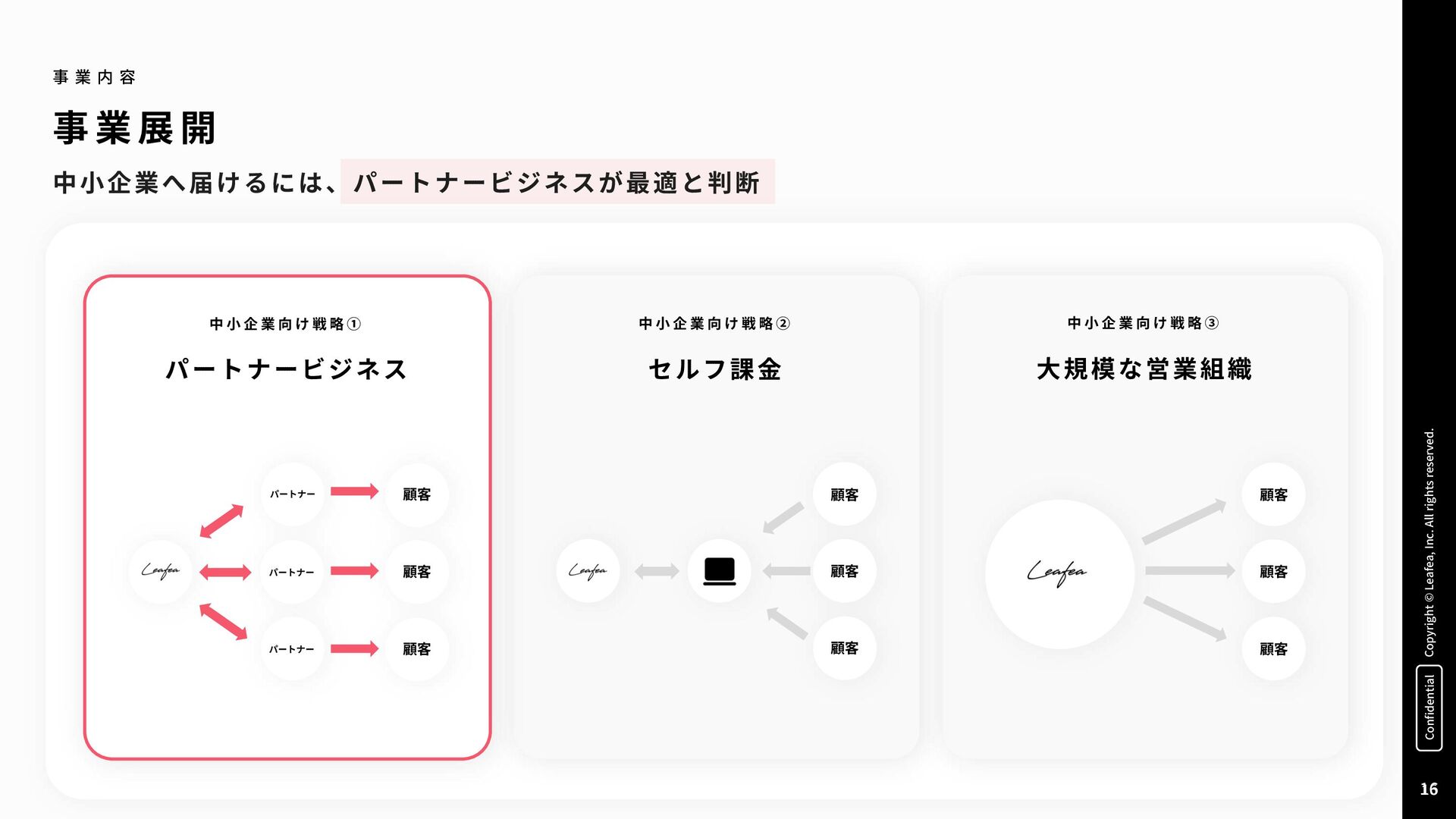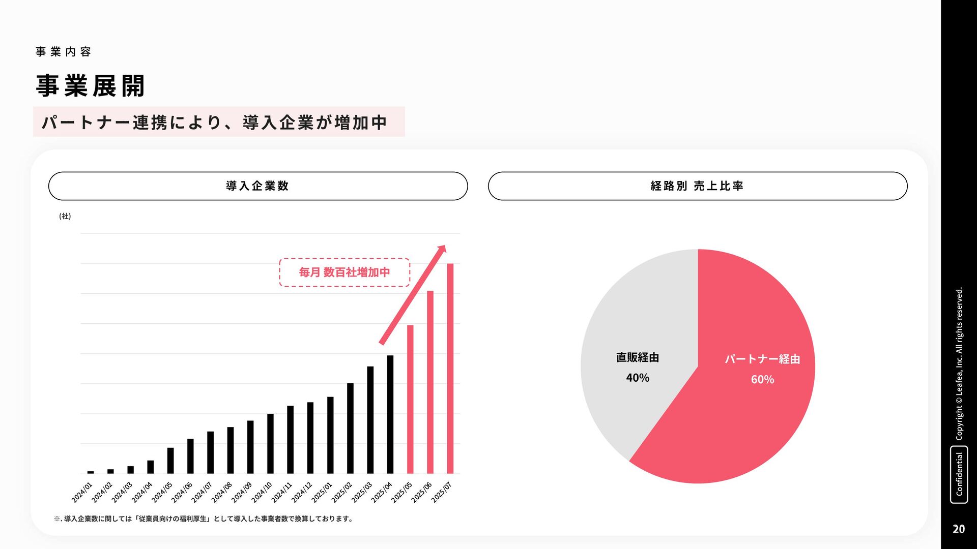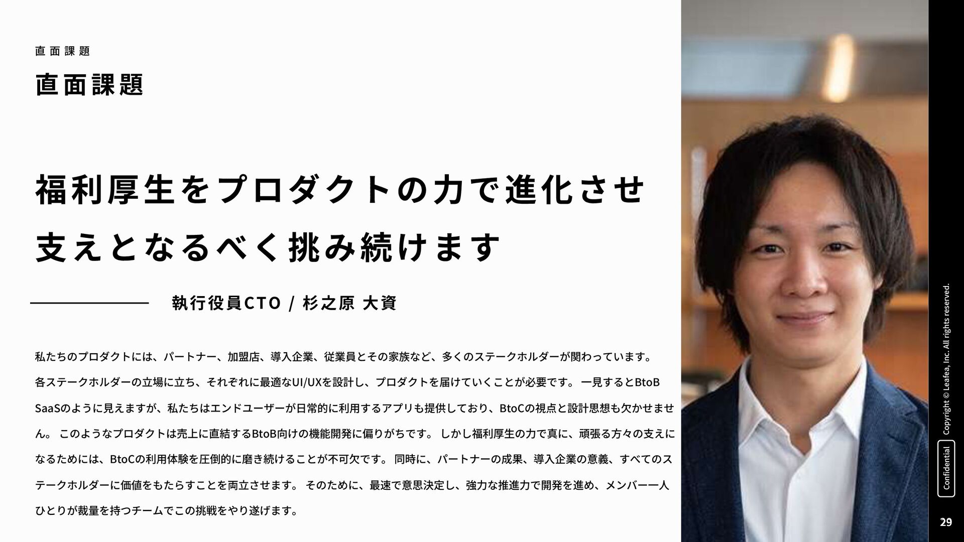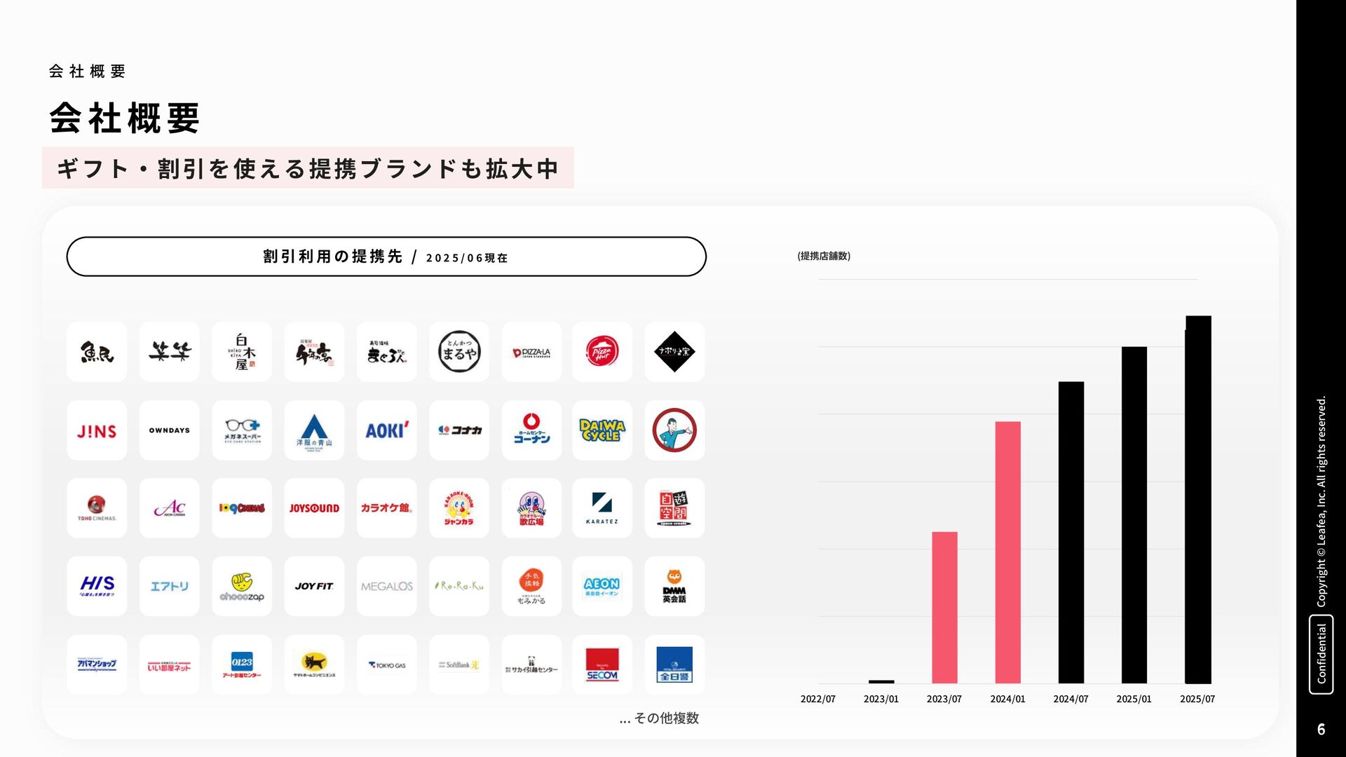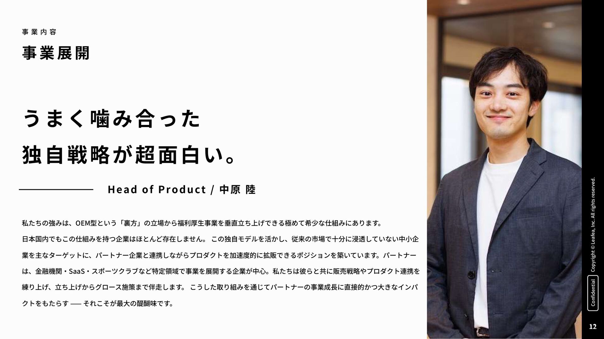 標 パ ー ト ナ ー 提 携 数 21 事 業 内 容 事 業 展 開 ※ ⽬標 パートナー提携数は、Leafea社がTierと定めるパートナー数のみで算出しております。 ※ ⽬標 導⼊企業数に関しては「従業員向けの福利厚⽣」として導⼊した事業者数で換算しております。複数の法⼈会員を持つ団体等での導⼊「法⼈会員向けの福利厚⽣」を合わせると、3,200社を超えております。 (社) ⽬ 標 導 ⼊ 企 業 数 ここからより⼀層、 スケールさせるフェーズにいる (社) 0 20 40 60 80 100 120 2024/01 2024/07 2025/01 2025/07 2026/01 2026/07 0 5,000 10,000 15,000 20,000 25,000 30,000 35,000 40,000 2024/01 2024/07 2025/01 2025/07 2026/01 2026/07 2027/01 2027/07 2028/01 2028/07 スケールさせる計画 スケールさせる計画