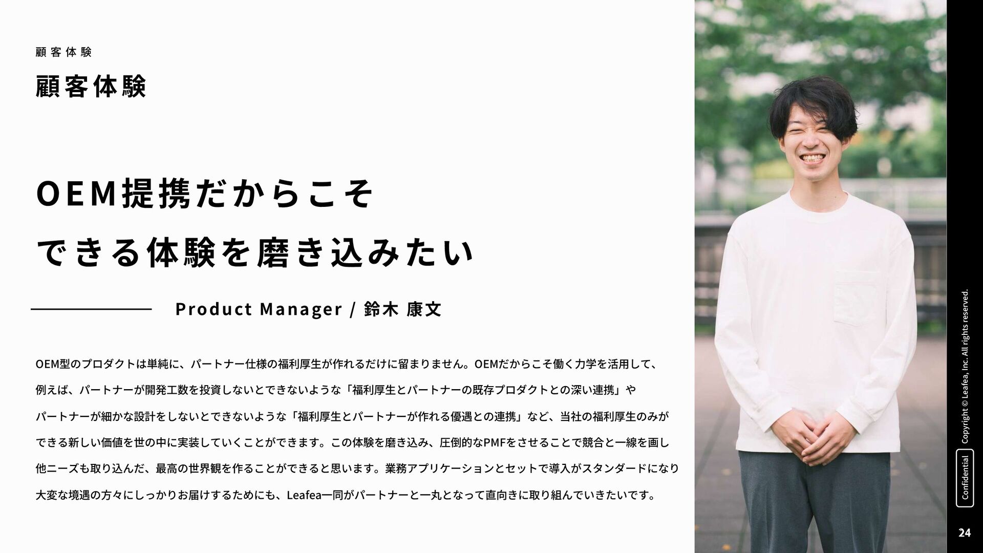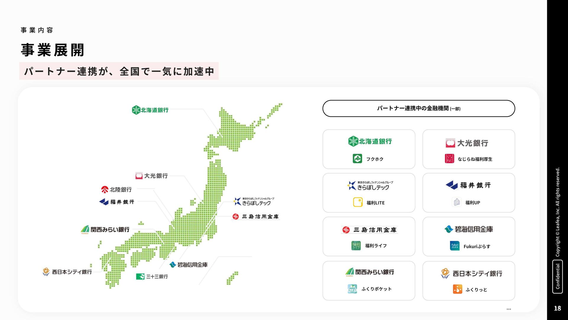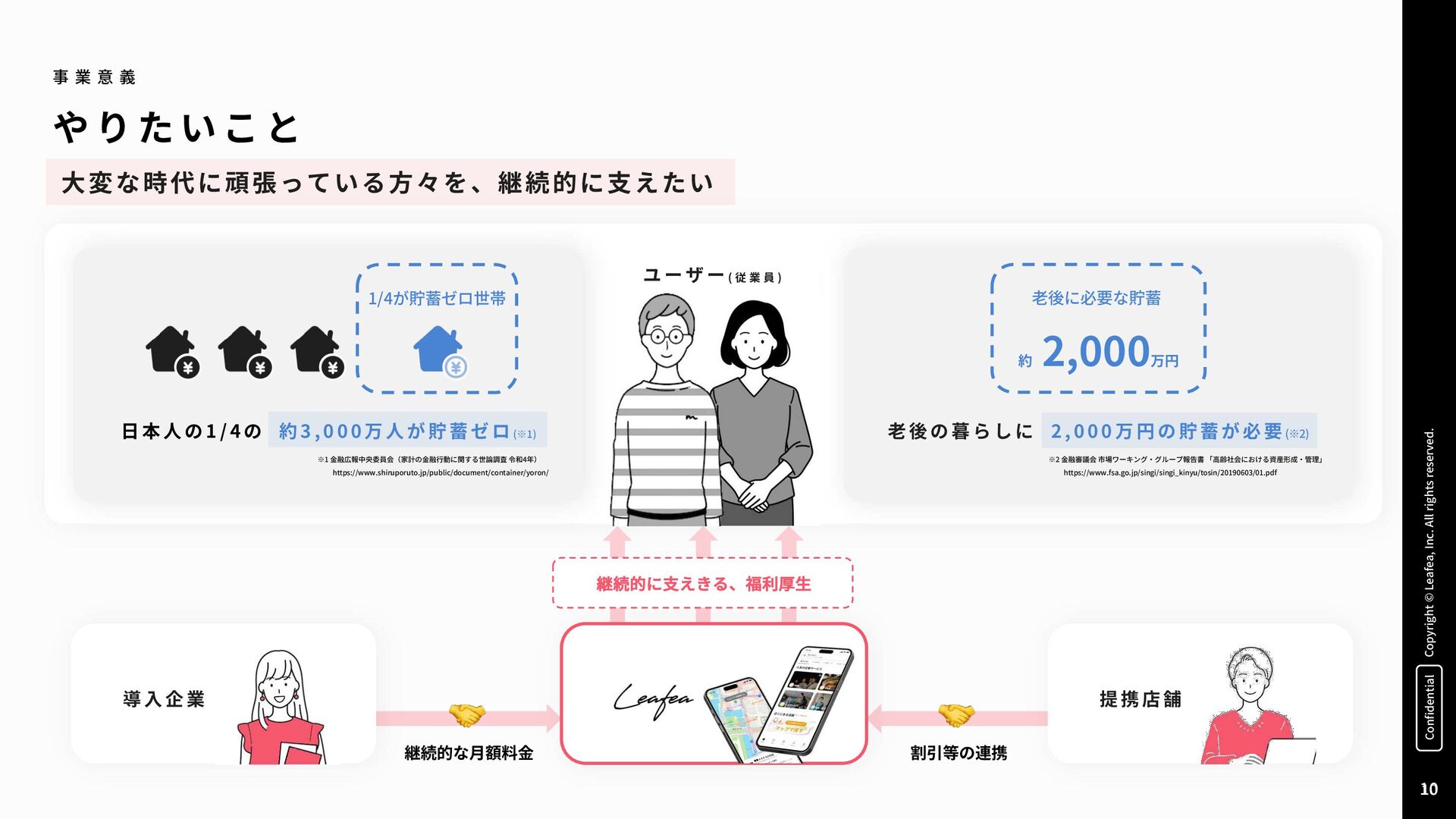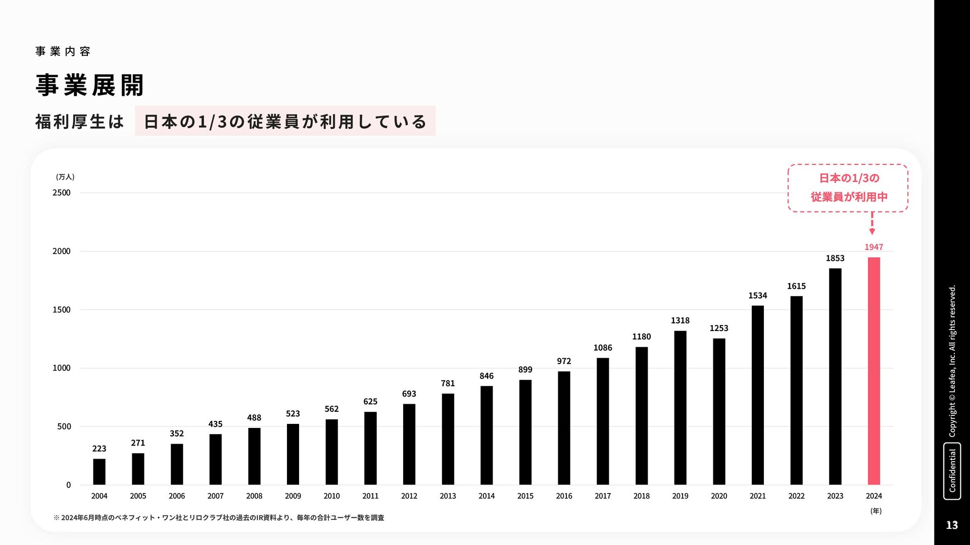 標 パ ー ト ナ ー 提 携 数 21 事 業 内 容 事 業 展 開 ※ ⽬標 パートナー提携数は、Leafea社がTierと定めるパートナー数のみで算出しております。 ※ ⽬標 導⼊企業数に関しては「従業員向けの福利厚⽣」として導⼊した事業者数で換算しております。複数の法⼈会員を持つ団体等での導⼊「法⼈会員向けの福利厚⽣」を合わせると、3,200社を超えております。 (社) ⽬ 標 導 ⼊ 企 業 数 ここからより⼀層、 スケールさせるフェーズにいる (社) 0 20 40 60 80 100 120 2024/01 2024/07 2025/01 2025/07 2026/01 2026/07 0 5,000 10,000 15,000 20,000 25,000 30,000 35,000 40,000 2024/01 2024/07 2025/01 2025/07 2026/01 2026/07 2027/01 2027/07 2028/01 2028/07 スケールさせる計画 スケールさせる計画