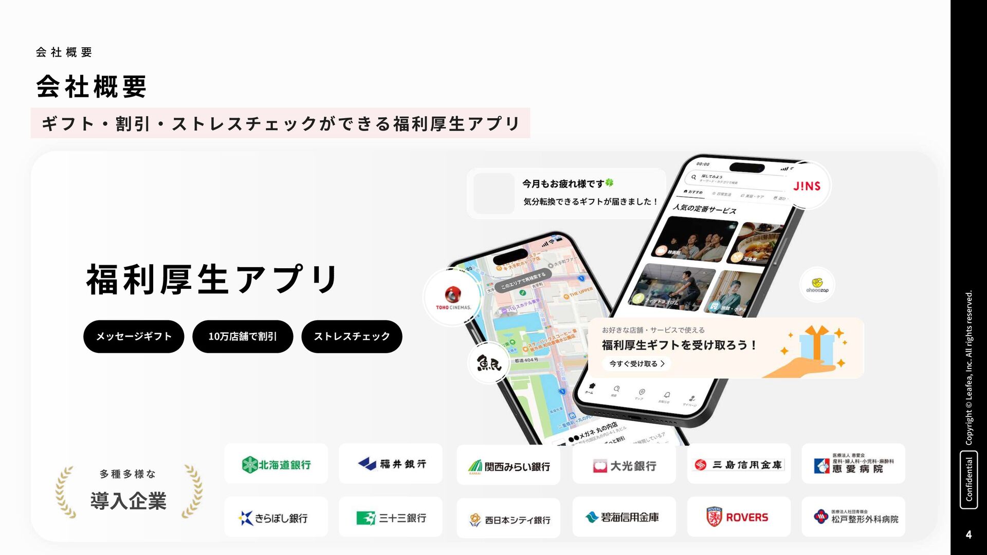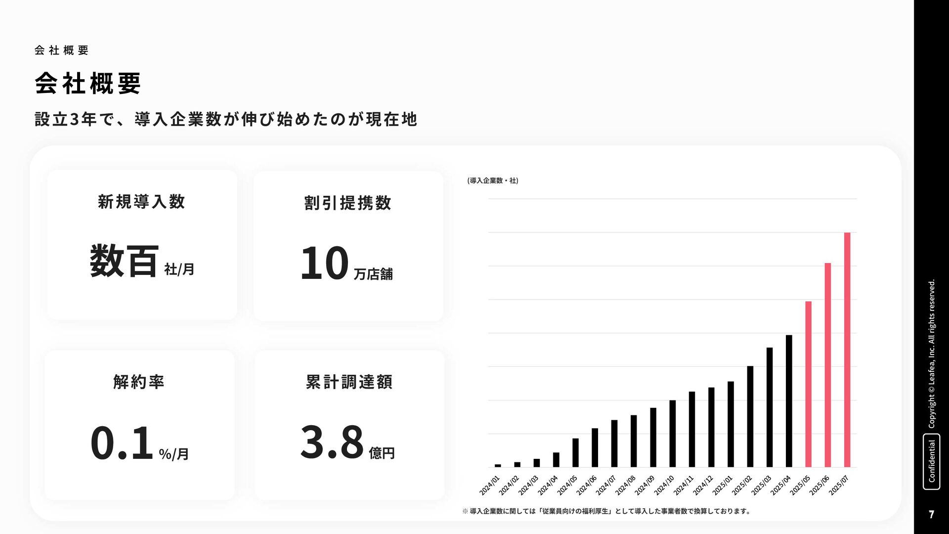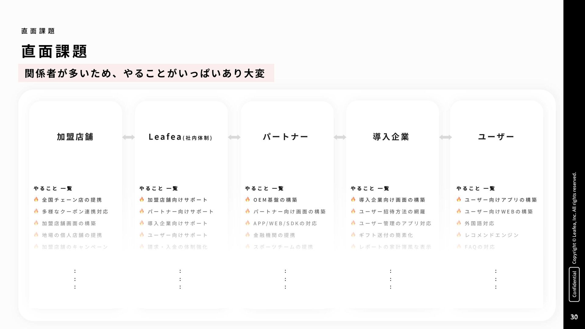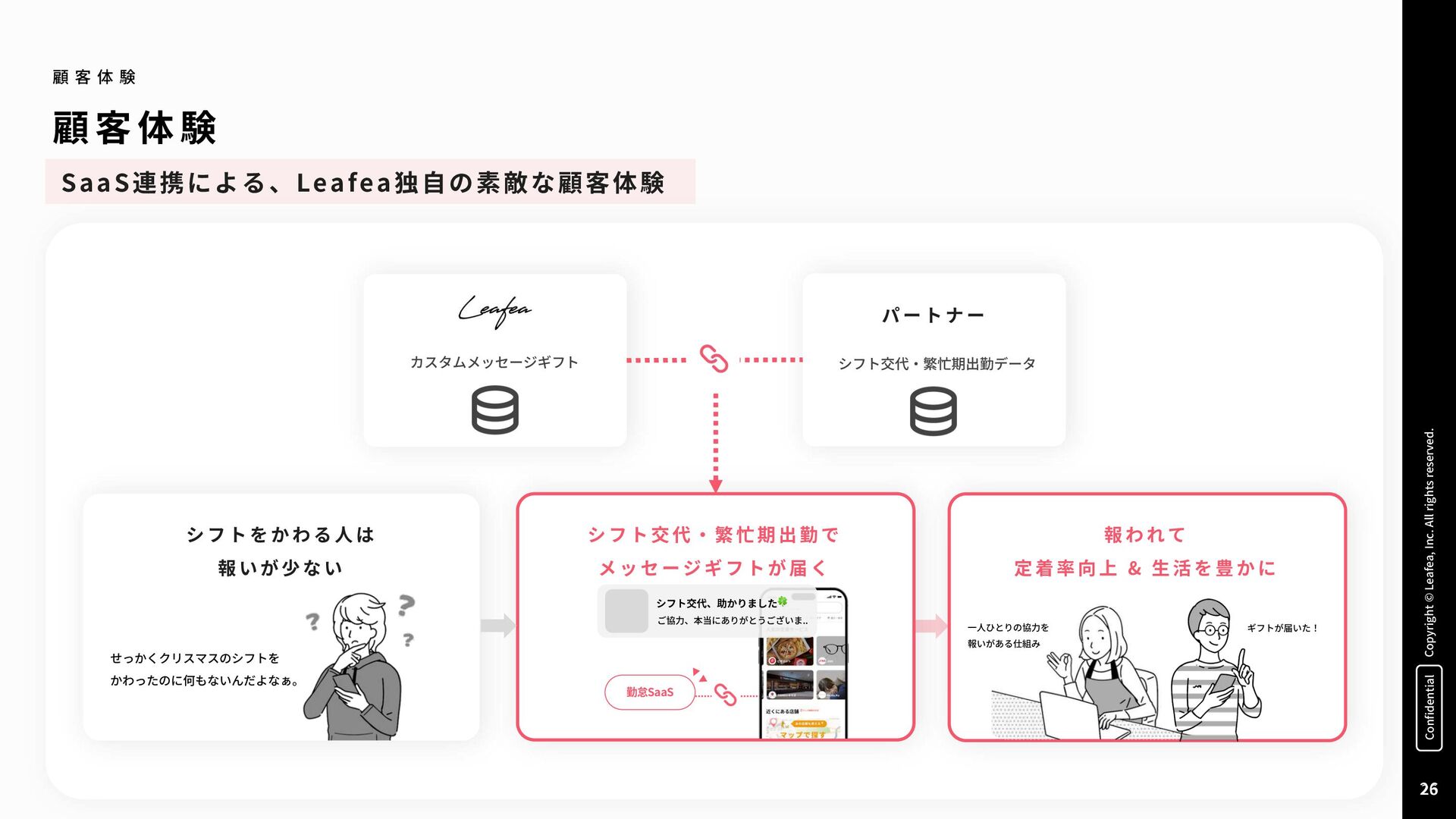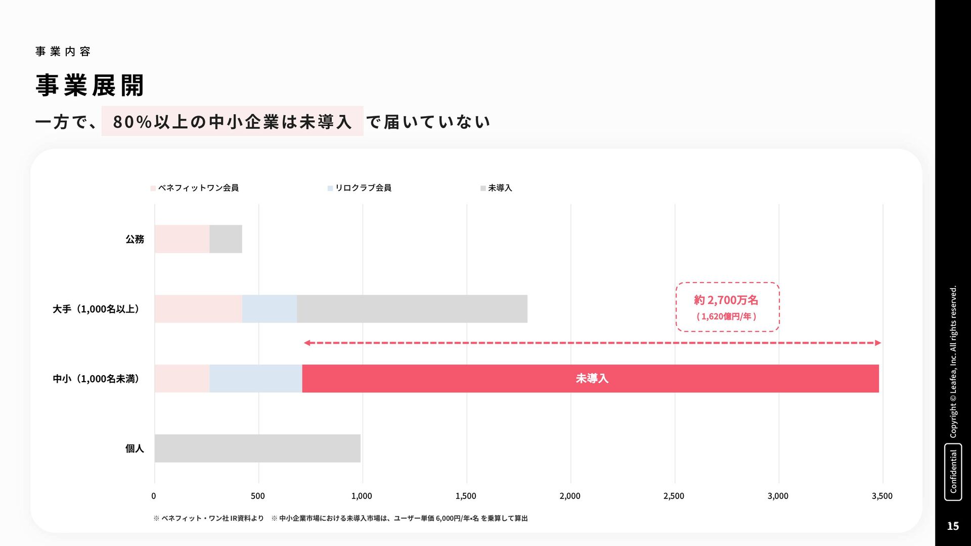 標 パ ー ト ナ ー 提 携 数 21 事 業 内 容 事 業 展 開 ※ ⽬標 パートナー提携数は、Leafea社がTierと定めるパートナー数のみで算出しております。 ※ ⽬標 導⼊企業数に関しては「従業員向けの福利厚⽣」として導⼊した事業者数で換算しております。複数の法⼈会員を持つ団体等での導⼊「法⼈会員向けの福利厚⽣」を合わせると、3,200社を超えております。 (社) ⽬ 標 導 ⼊ 企 業 数 ここからより⼀層、 スケールさせるフェーズにいる (社) 0 20 40 60 80 100 120 2024/01 2024/07 2025/01 2025/07 2026/01 2026/07 0 5,000 10,000 15,000 20,000 25,000 30,000 35,000 40,000 2024/01 2024/07 2025/01 2025/07 2026/01 2026/07 2027/01 2027/07 2028/01 2028/07 スケールさせる計画 スケールさせる計画