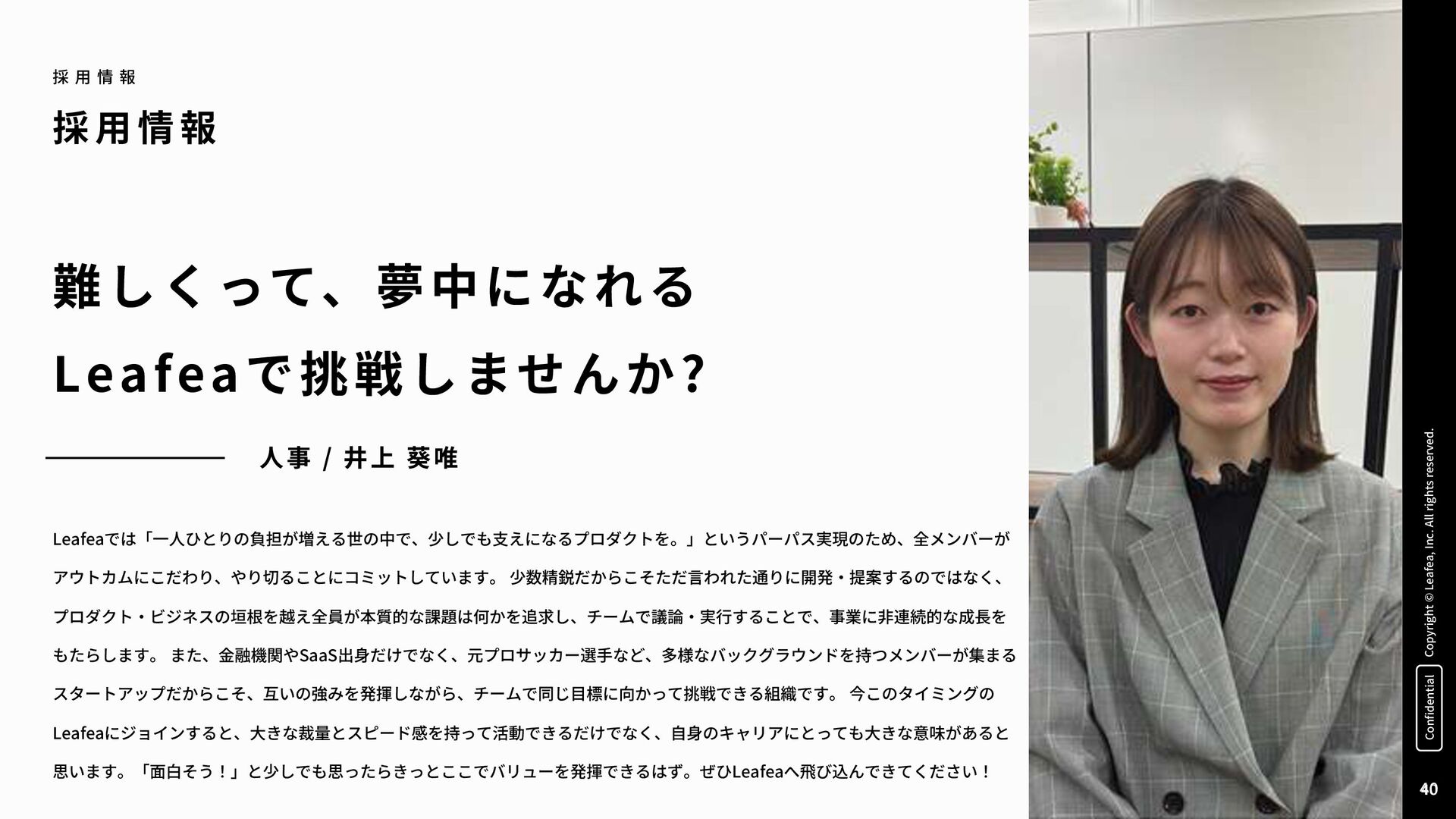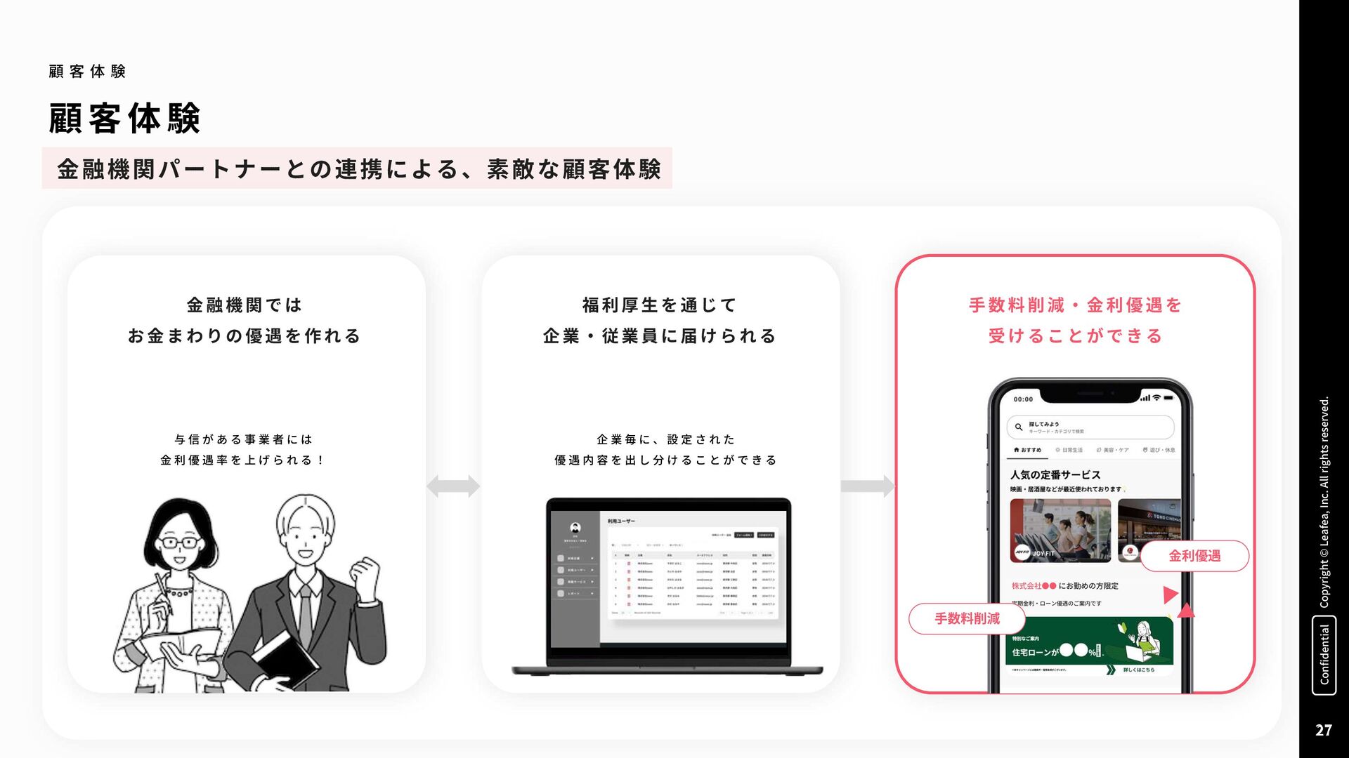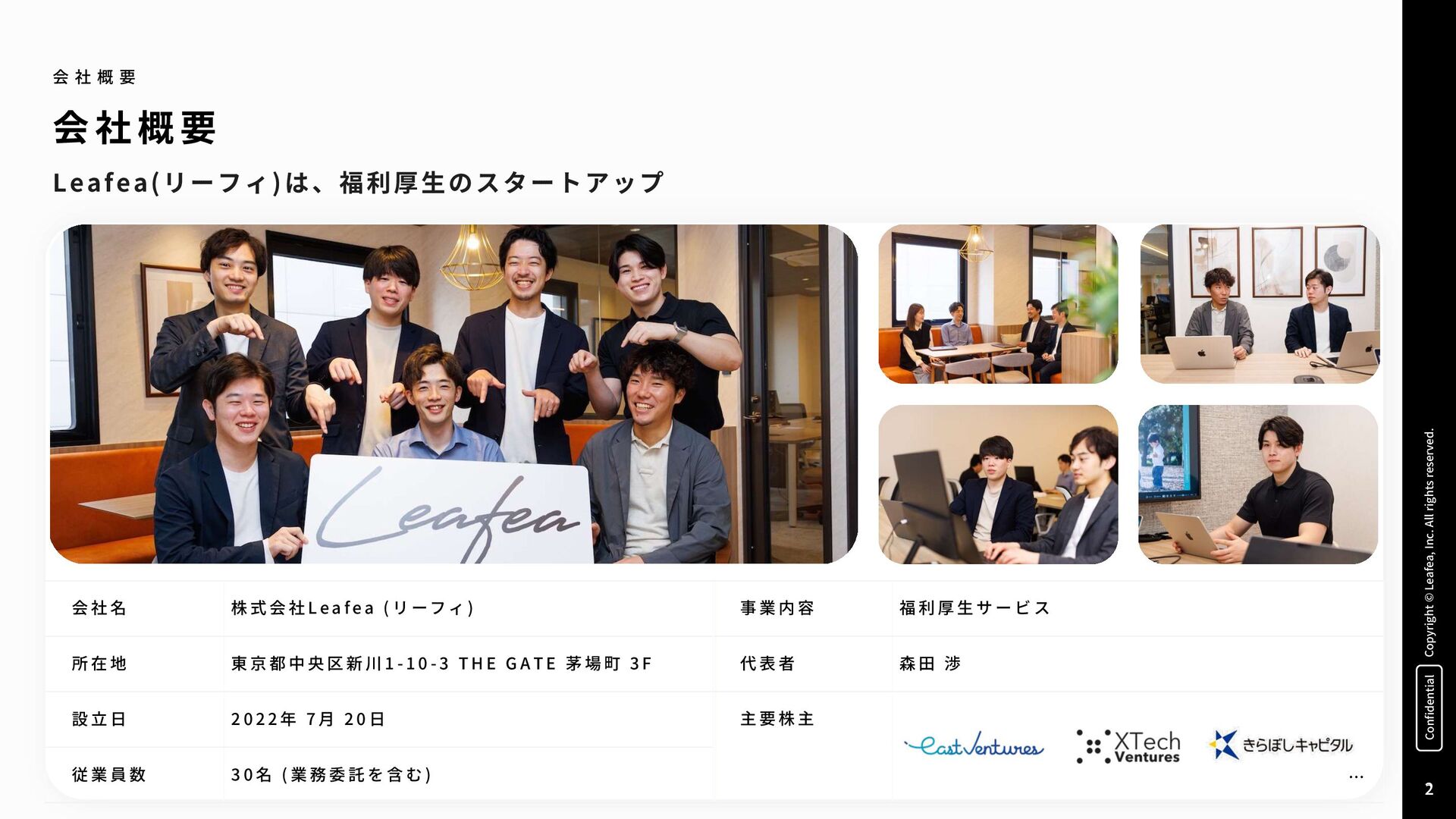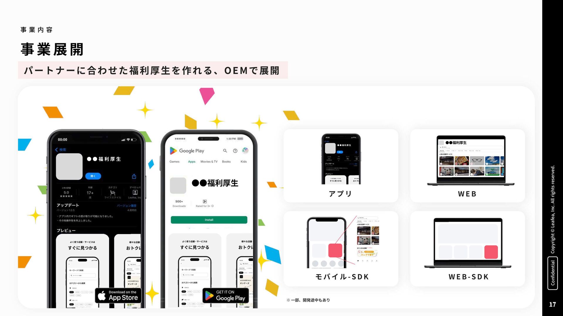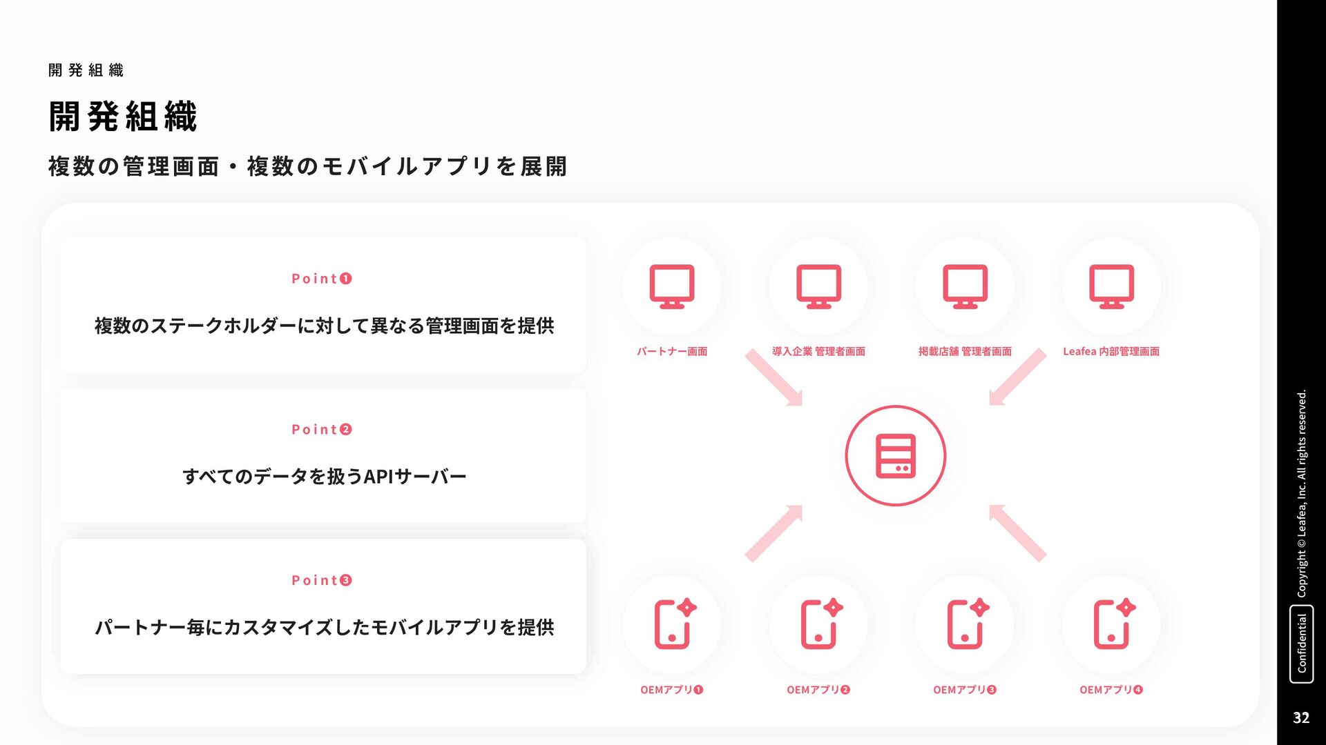 標 パ ー ト ナ ー 提 携 数 21 事 業 内 容 事 業 展 開 ※ ⽬標 パートナー提携数は、Leafea社がTierと定めるパートナー数のみで算出しております。 ※ ⽬標 導⼊企業数に関しては「従業員向けの福利厚⽣」として導⼊した事業者数で換算しております。複数の法⼈会員を持つ団体等での導⼊「法⼈会員向けの福利厚⽣」を合わせると、3,200社を超えております。 (社) ⽬ 標 導 ⼊ 企 業 数 ここからより⼀層、 スケールさせるフェーズにいる (社) 0 20 40 60 80 100 120 2024/01 2024/07 2025/01 2025/07 2026/01 2026/07 0 5,000 10,000 15,000 20,000 25,000 30,000 35,000 40,000 2024/01 2024/07 2025/01 2025/07 2026/01 2026/07 2027/01 2027/07 2028/01 2028/07 スケールさせる計画 スケールさせる計画