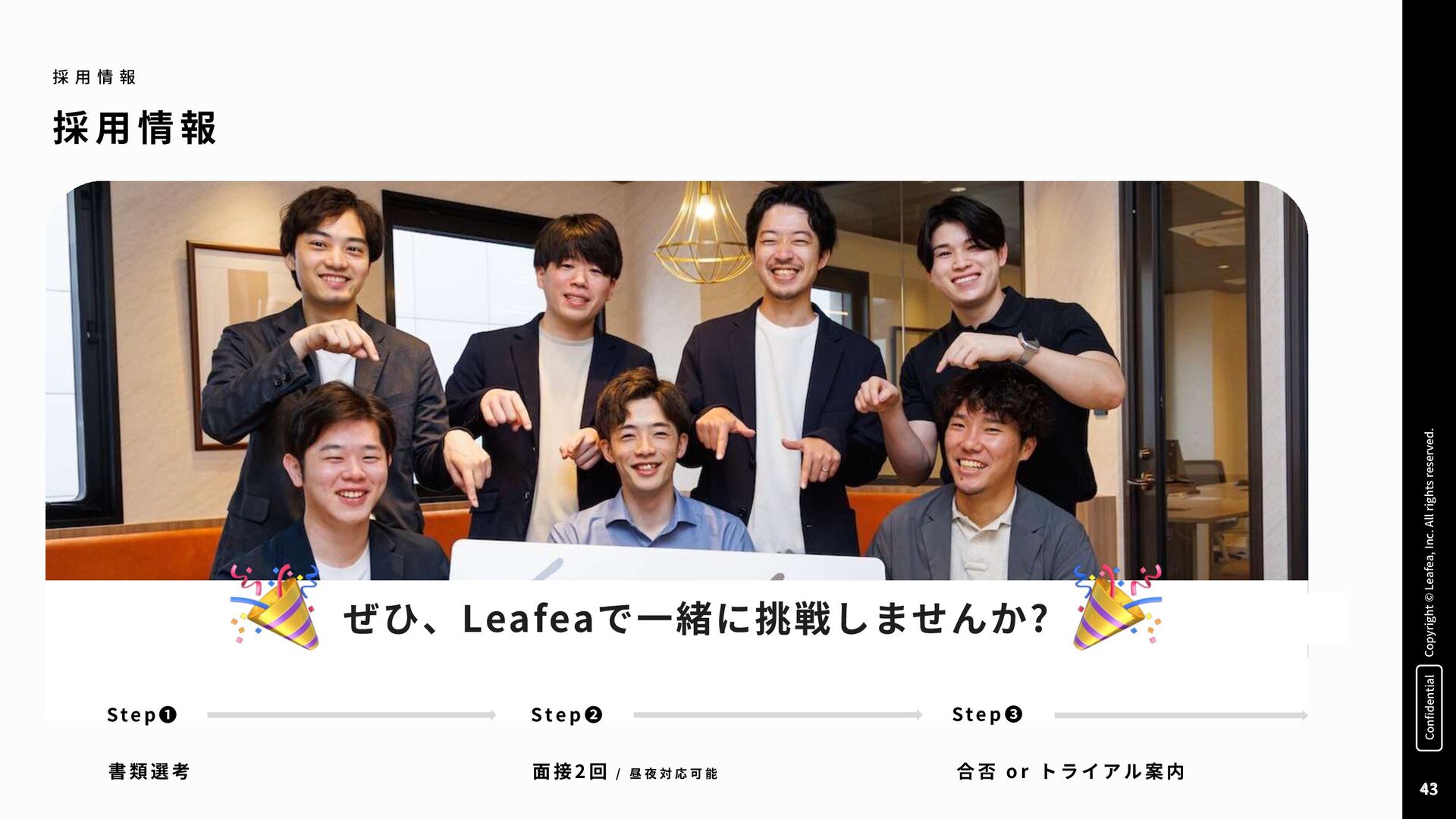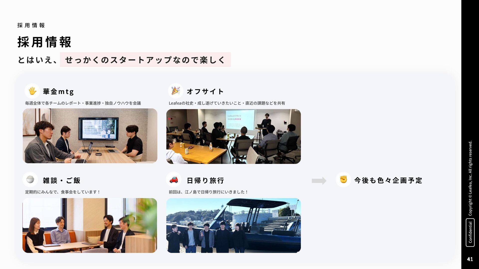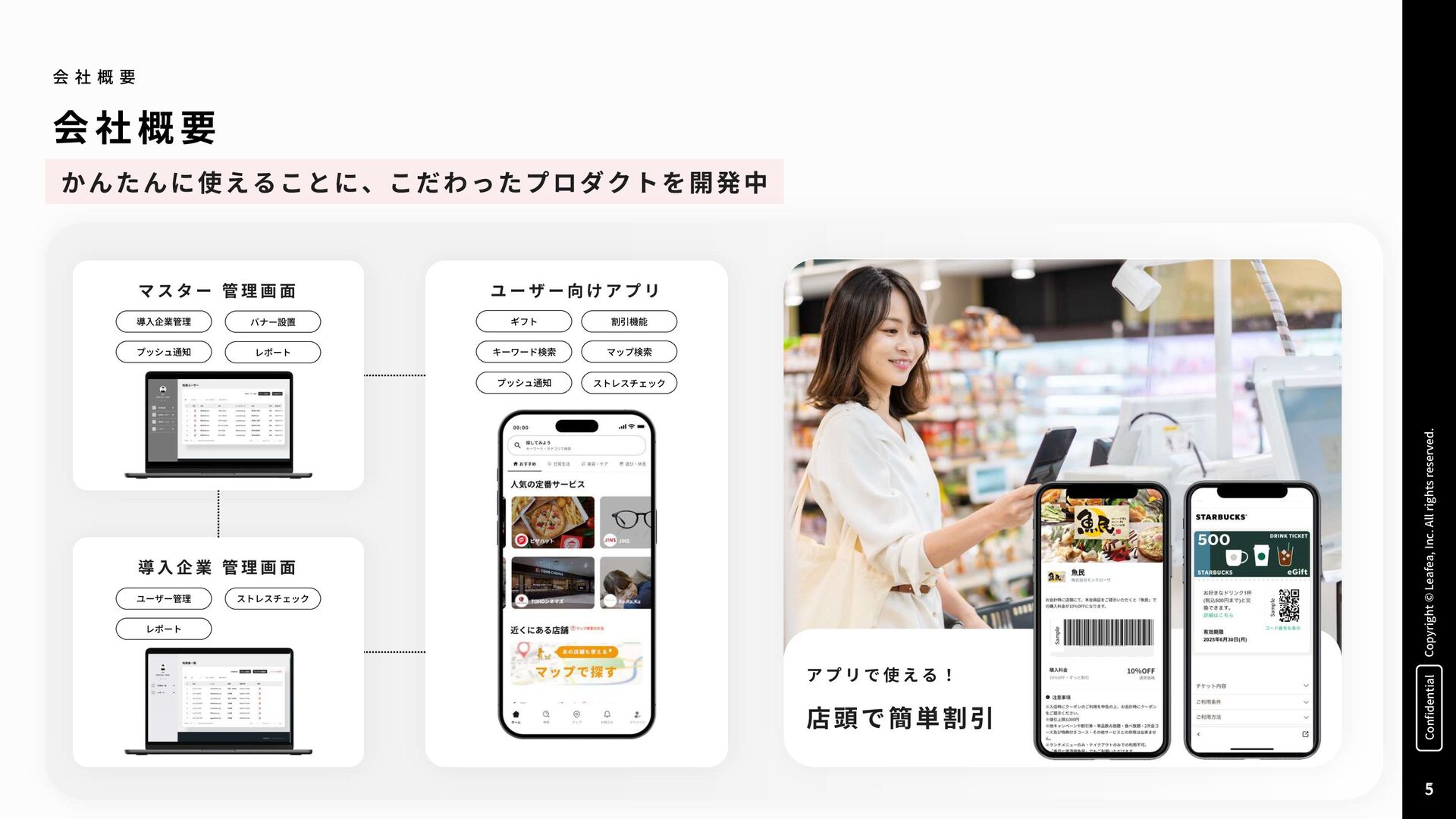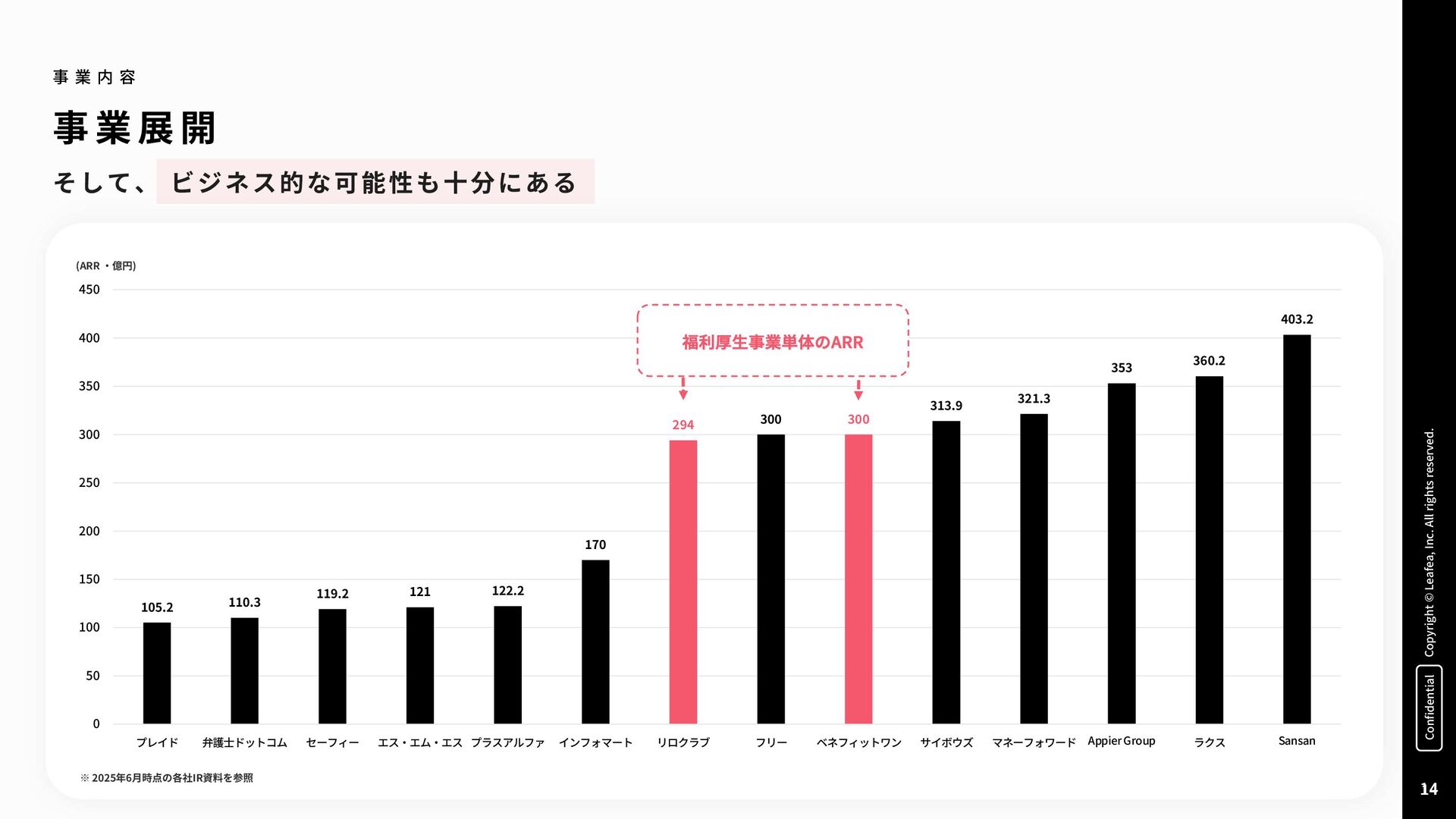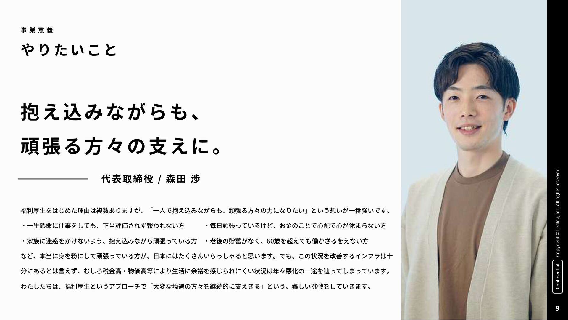 標 パ ー ト ナ ー 提 携 数 21 事 業 内 容 事 業 展 開 ※ ⽬標 パートナー提携数は、Leafea社がTierと定めるパートナー数のみで算出しております。 ※ ⽬標 導⼊企業数に関しては「従業員向けの福利厚⽣」として導⼊した事業者数で換算しております。複数の法⼈会員を持つ団体等での導⼊「法⼈会員向けの福利厚⽣」を合わせると、3,200社を超えております。 (社) ⽬ 標 導 ⼊ 企 業 数 ここからより⼀層、 スケールさせるフェーズにいる (社) 0 20 40 60 80 100 120 2024/01 2024/07 2025/01 2025/07 2026/01 2026/07 0 5,000 10,000 15,000 20,000 25,000 30,000 35,000 40,000 2024/01 2024/07 2025/01 2025/07 2026/01 2026/07 2027/01 2027/07 2028/01 2028/07 スケールさせる計画 スケールさせる計画